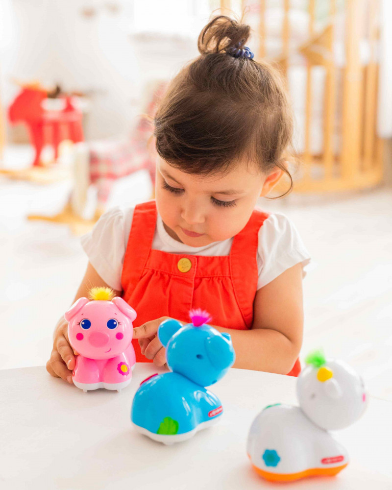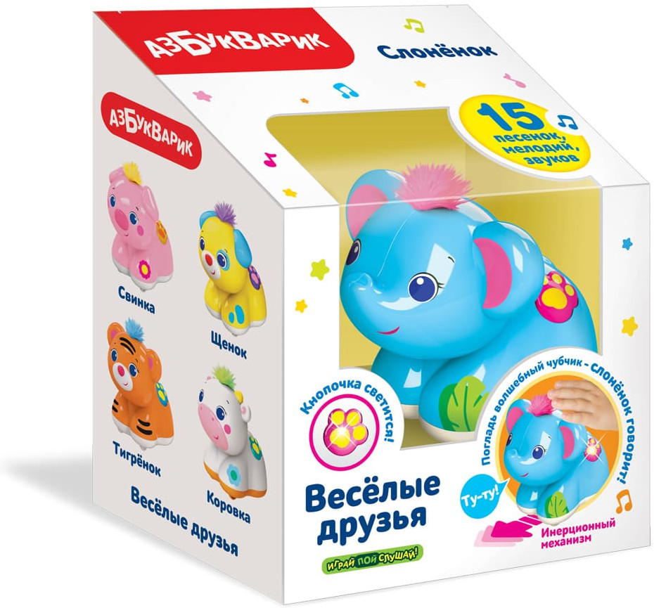 Серия: Веселые друзья Забавный слоненок с пушистым чубчиком приведет малыша в восторг. А чубчик у него — волшебный! Нужно просто его погладить — и слоник заговорит! Нажимая на кнопочку, малыш послушает веселые песенки и мелодии («Слон», «Песенка про зоопарк», «Весёлые противоположности», «Полька», «Кукарача»). А если погладить чубчик во время звучания — слоненок будет подпевать. В игрушке также есть инерционный механизм — зверюшка ездит не хуже машинки. |