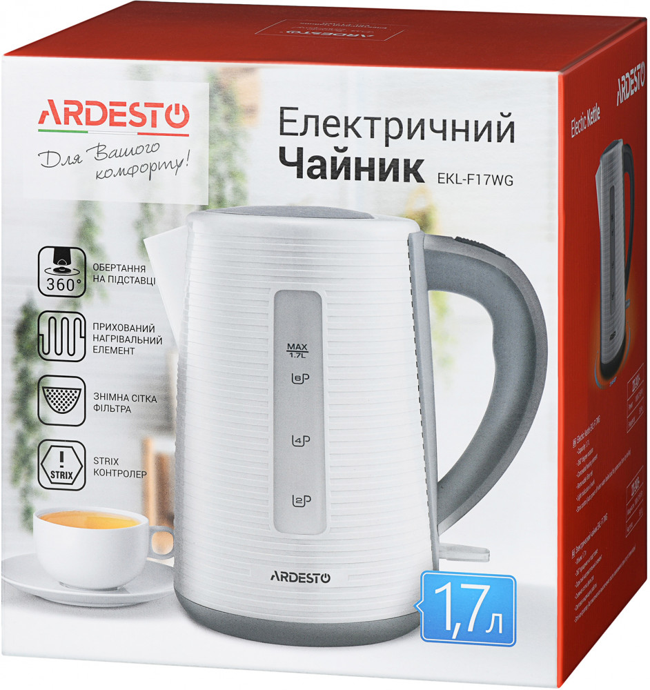 Ardesto Чайник электрический EKL-F17WGВ данный момент этот товар отсутствует в продаже. Возможно, у нас найдется аналогичный или похожий товар здесь. Электрочайник белого цвета с контроллером Strix для защиты от перегрева. Объем чайника EKL-F17WG составляет 1,7 литра, а подставка обеспечивает оборот на 360°. Материал корпуса — надежный и долговечный поликарбонат. |