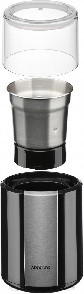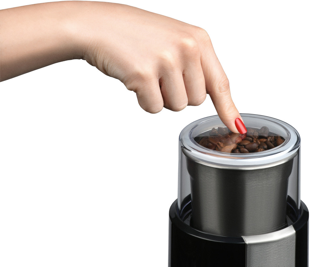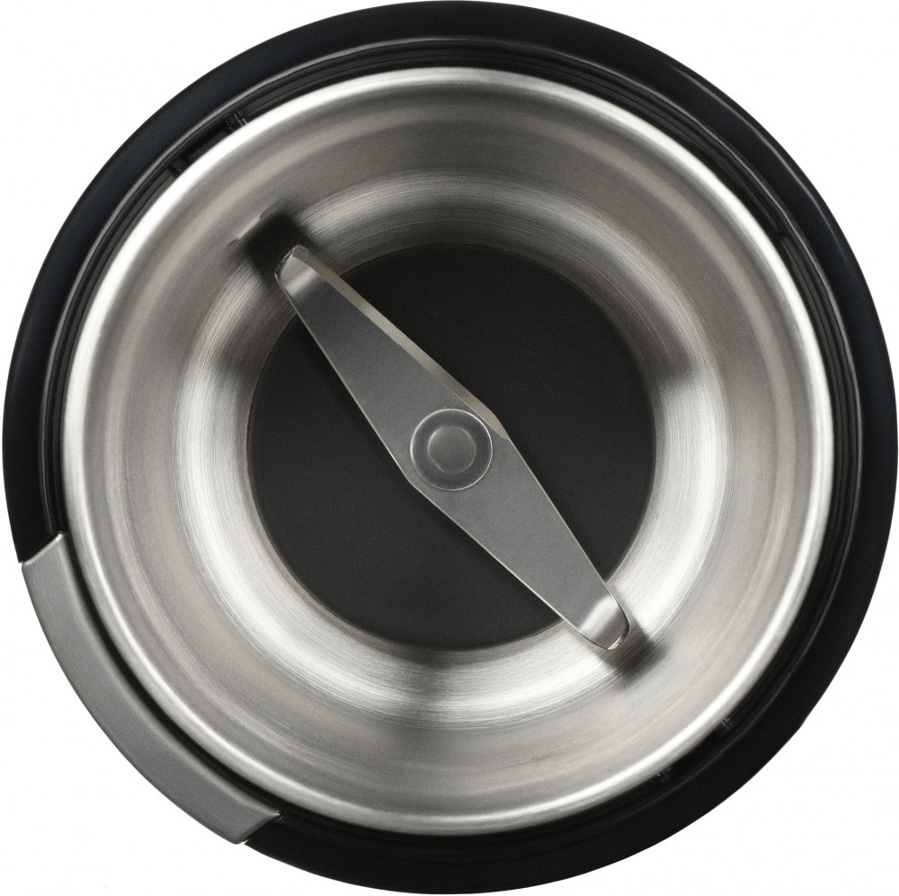 Корпус кофемолки выполнен из прочного матового черного пластика и вставок из шлифованного металла. Прозрачная крышка с прорезиненным уплотнителем позволяет контролировать процесс работы, а съемный стальной контейнер на 60 г – простой доступ к измельченным продуктам и легкую очистку.