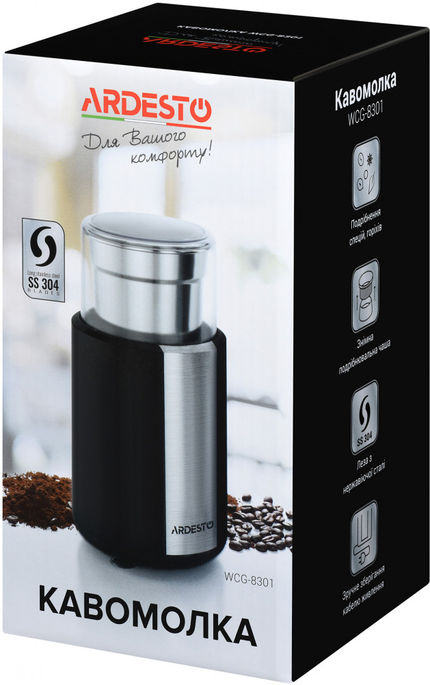 Качественный помол обеспечивает острое лезвие из нержавеющей стали. Кофемолку также можно использовать для измельчения орехов, специй и сыпучих продуктов. Безопасная работа реализована за счет продуманной конструкции — запуск кофемолки происходит только при нажатии крышки.