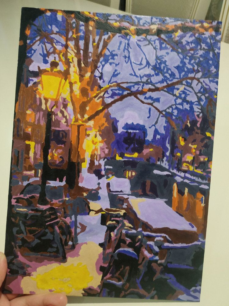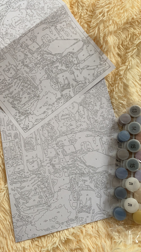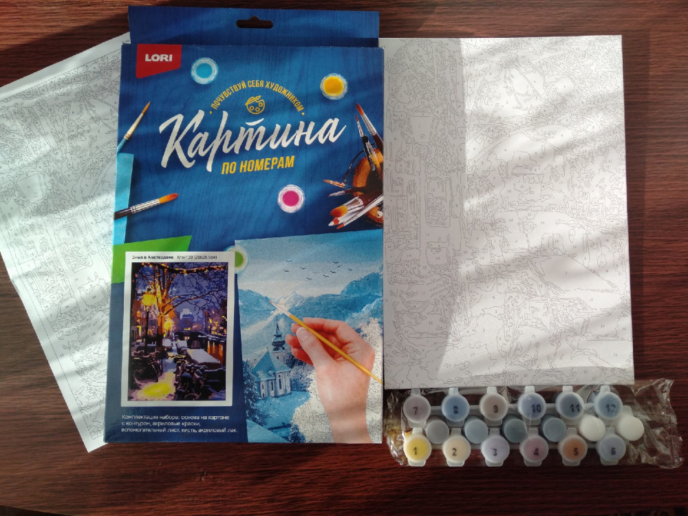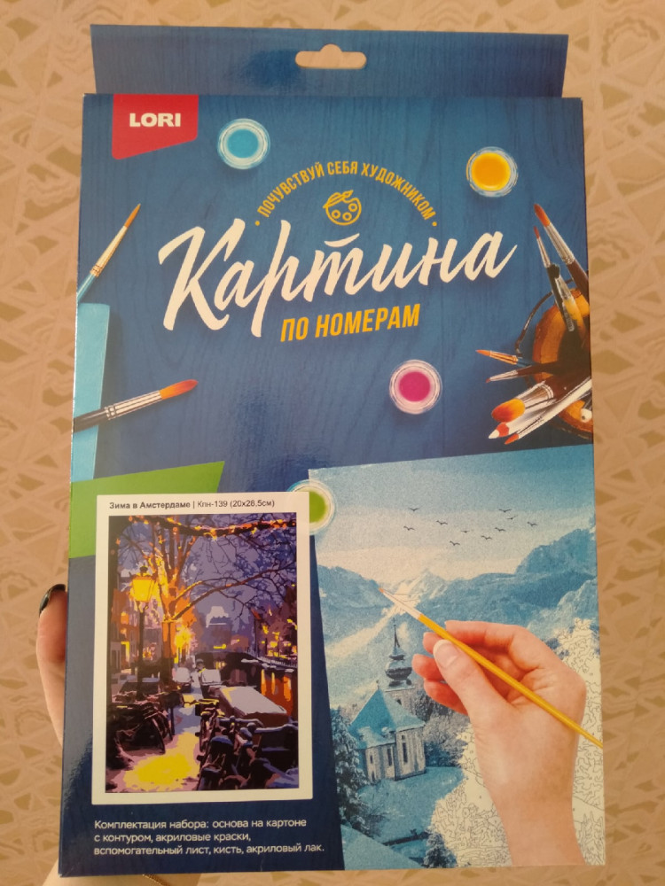 Картина по номерам соответствует описанию. Набор пришёл в хорошем состоянии, краски были свежие, очень жидкие и при нанесении давали матовый оттенок. Сохнут они максимально быстро, поэтому долго держать открытую баночку не советую (на крышке краска моментально высохла). Кисточка в наборе одна, лично мне было удобно работать ей. Сам рисунок был на картоне, очень плотном. Но данный «холст» немного кривой. Есть много маленьких деталей, поэтому работать было, немного сложно, в целом такая картина подойдет для терпеливых и усидчивых людей. Я закончила картину за 3 недели. Результат понравился. У красок есть запах, первые два дня было очень не комфортно от него. В конце картина получила матовый оттенок, но если нанести лак (у которого тоже есть запах) то цвета картины станут глянцевые и более насыщенные. На фото картина уже покрыта лаком.
