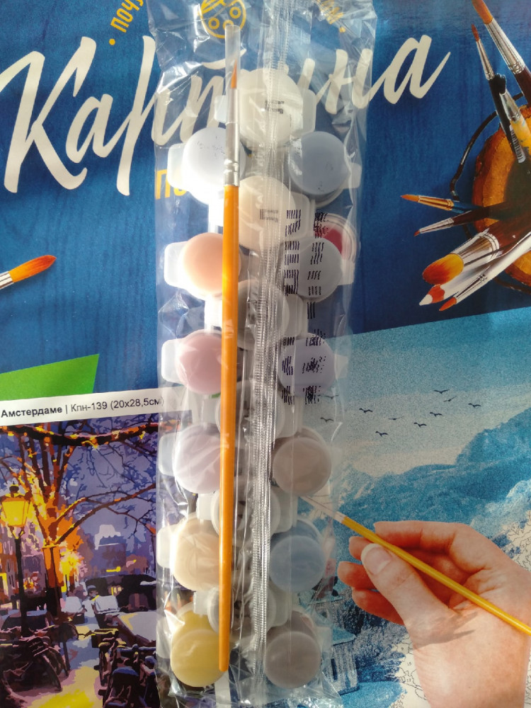 картина хорошая, интересная но в описание указано что идёт в комплекте краски и кисти,кистей не было...