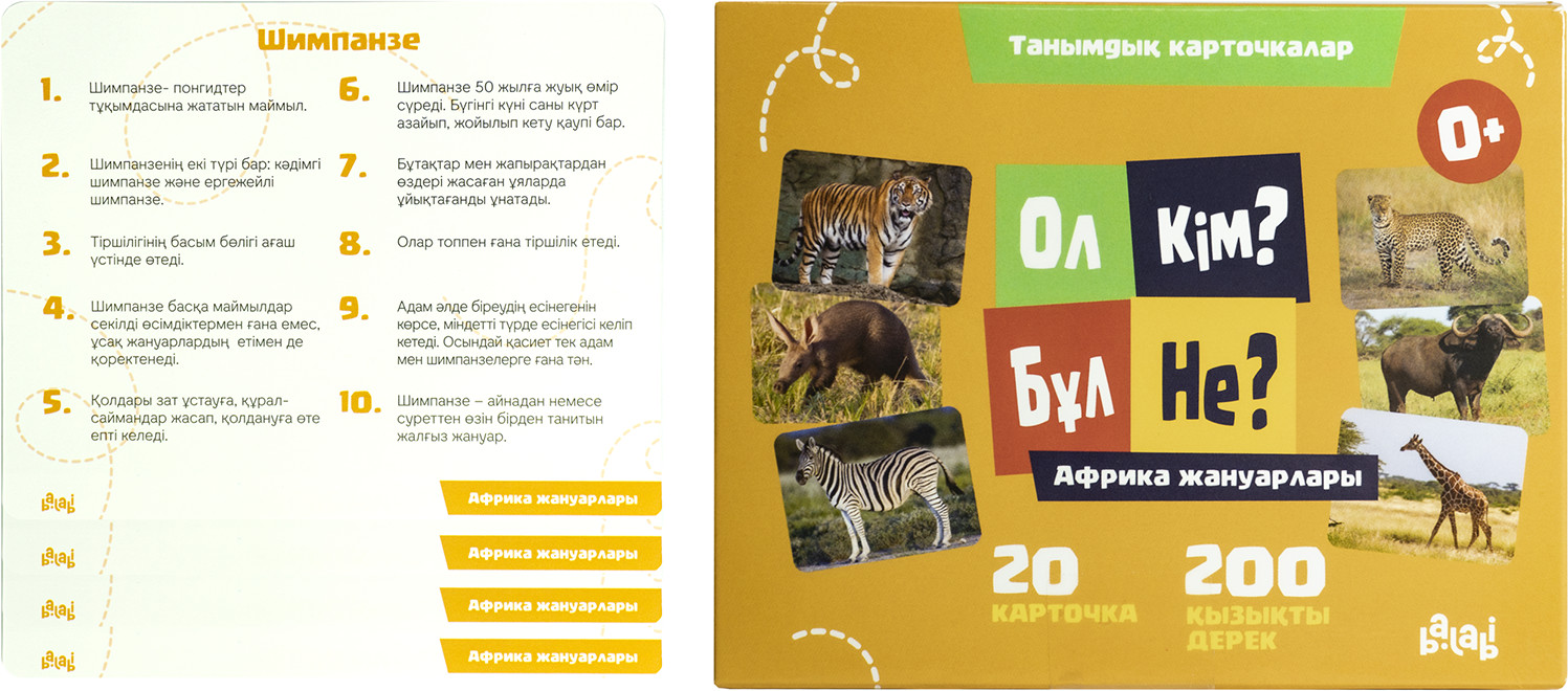 Карточки Домана «Ол кім? Бұл не? Африка жануарлары»В данный момент этот товар отсутствует в продаже. Возможно, у нас найдется аналогичный или похожий товар здесь. «Ол кім? Бұл не?» танымдық карточкалары — балақайды өзін қоршаған мына әлеммен жақынырақ таныстырып, оның қыр-сырына үңілуге мүмкіндік беретін керемет құрал. Карточкалар кішкентай алақанға ұстауға ыңғайлы әрі оның кез-келген қылығына шыдамды. Қай жерде, қай уақытта болмасын неше түрлі ойындар ойнауға мүмкіндік бар. |