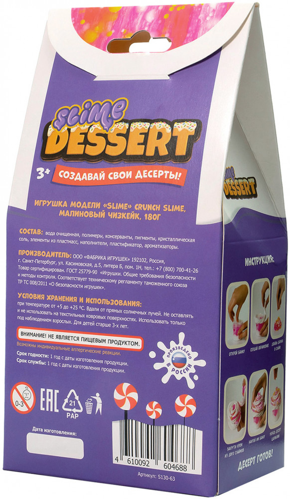 Slime Набор для творчества «Малиновый чизкейк»В данный момент этот товар отсутствует в продаже. Возможно, у нас найдется аналогичный или похожий товар здесь. Серия: Десерт Уникальный набор слайма и вложений для создания игрушечных десертов! Создай свои слайм-десерты! Это увлекательная игрушка для детей и отличный антистресс для взрослых. По своему внешнему виду слайм напоминает слизь, однако не липнет к рукам, не оставляет следов на одежде и руках, не разваливается. Этот удивительный материал также обладает свойствами неньютоновской жидкости, являясь твердым телом и жидкостью одновременно. |