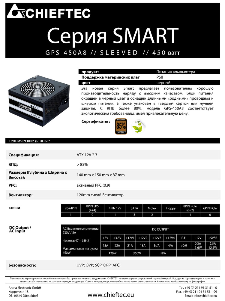 С момента своего основания в октябре 1994 года компания Arena Electronic GmbH, представляющая марку Chieftec , входит в число ведущих предприятий компьютерной индустрии. Постоянные инновационные разработки, а также инвестиции в современное производственное оборудование по изготовлению десктопов, корпусов типа «башня» и промышленных корпусов подчеркивают стремление к абсолютному лидерству. Многочисленные награды прошлых лет подтверждают данный факт также в отношении блоков питания и...