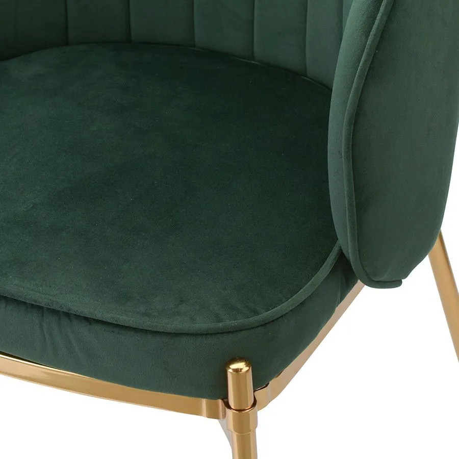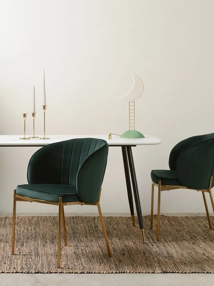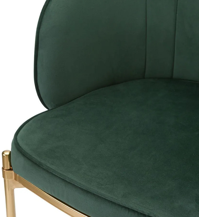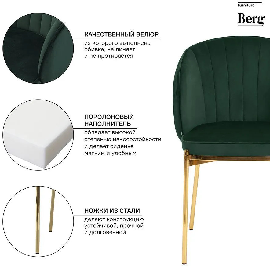 Комфорт во время отдыха на стуле создается за счет мягкого сиденья с наполнителем из пенополиуретана и высокой закругленной спинки. Обивка из бархатистого велюра, украшенная декоративной строчкой, придает модели особый шарм. Эстетический потенциал материала настолько высок, что ему сложно найти конкурентов. Помимо презентабельного вида и приятных тактильных ощущений, ткань обладает хорошими эксплуатационными характеристиками, такими как прочность, износоустойчивость и долговечность. Ножки мебели выполнены из железа с гальваническим покрытием, что обеспечивает конструкции надежность и защиту от коррозии.