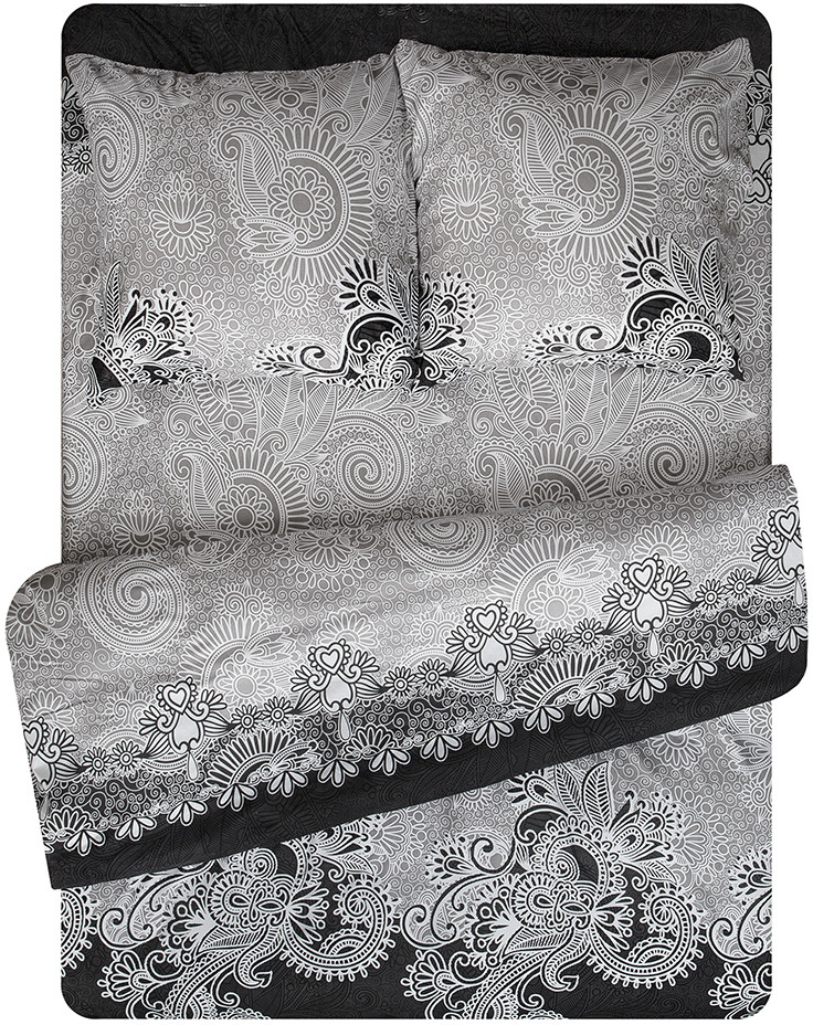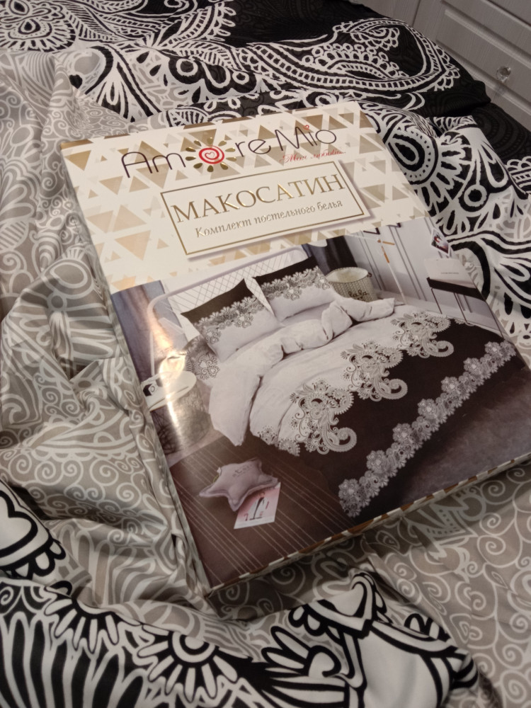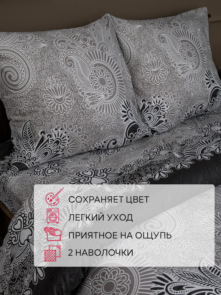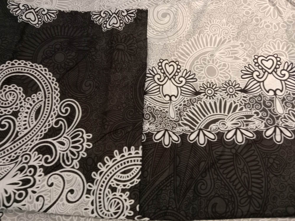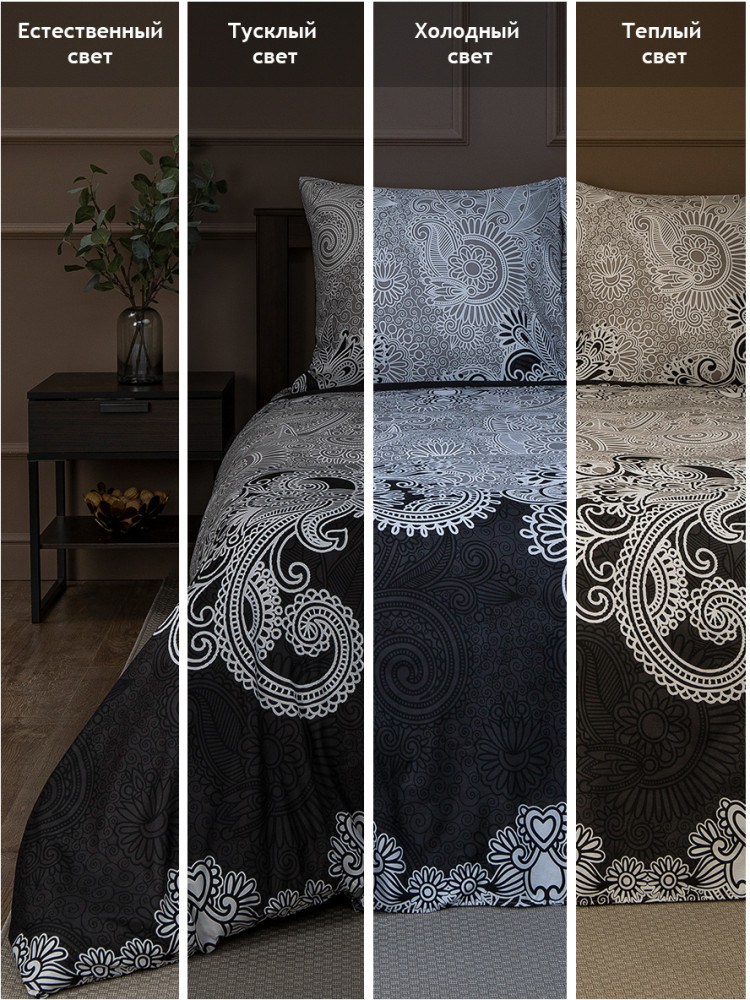 Комплект соответствует указанным размерам, расцветка тоже, цвета насыщенные.Ткань на ощупь приятная. Минус в том, что наволочки разного принта. Одна светлая, другая черная, наверное, чтобы с мужем подушки не путать:))Посмотрим как будет после стирки