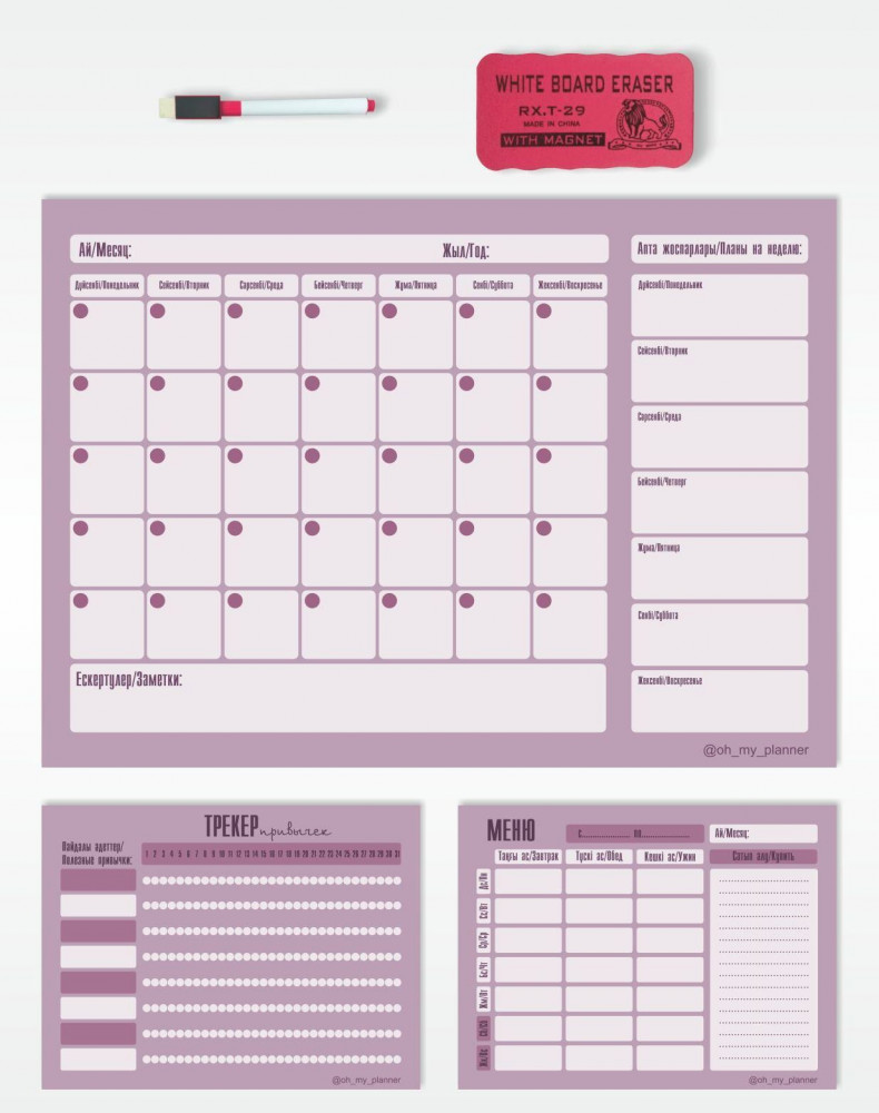 Oh My Planner Набор магнитных планеров с маркером и губкойВ данный момент этот товар отсутствует в продаже. Возможно, у нас найдется аналогичный или похожий товар здесь. Магнитный планер в наборе А3 с меню А5 и трекером привычек А5 — это инструмент наглядного планирования. Пропишите все планы и важные даты в планер А3, составьте меню на неделю и фиксируйте полезные привычки в трекере. |