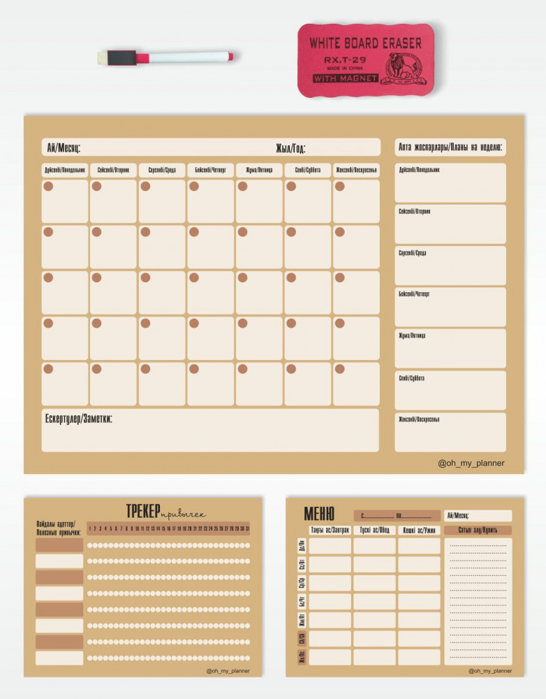 Oh My Planner Набор магнитных планеров с маркером и губкойВ данный момент этот товар отсутствует в продаже. Возможно, у нас найдется аналогичный или похожий товар здесь. Магнитный планер в наборе А3 с меню А5 и трекером привычек А5 — это инструмент наглядного планирования. Пропишите все планы и важные даты в планер А3, составьте меню на неделю и фиксируйте полезные привычки в трекере. |
