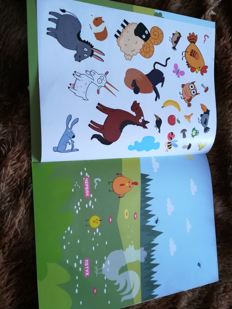 Книга понравилась сыну (2,5 года), наклейки крупные, удобно клеить ребенку. За 10 мин все наклеили и теперь используем как книжку, рассматриваем картинки и рассказываем чем заняты животные.