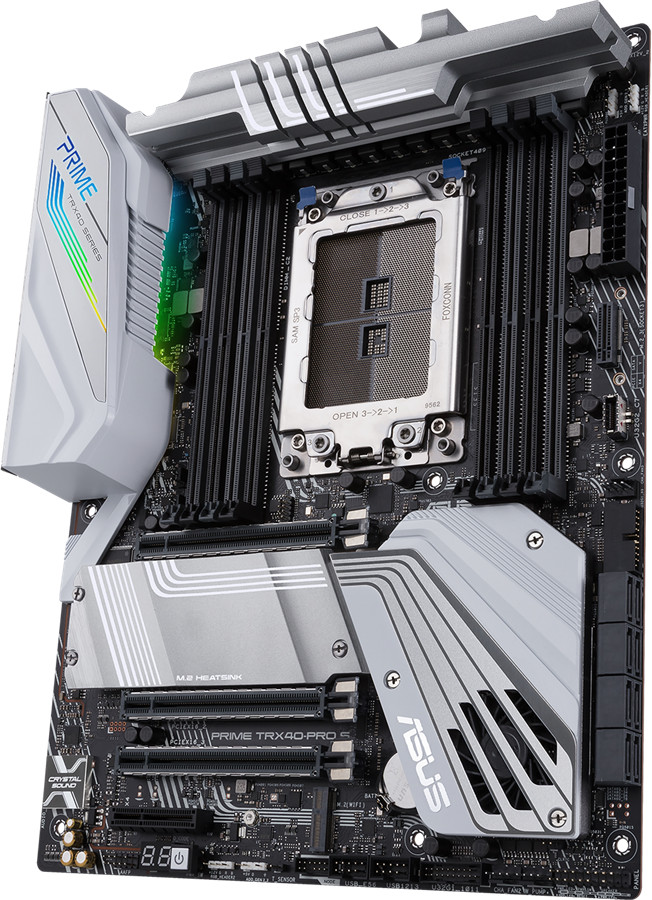 Новый AMD Socket sTRX4 совместим с процессорами AMD Ryzen Threadripper 3-го поколения, имеющими до 64 ядер, до 64 линий PCIe 4.0 и расчетную тепловую мощность 280 Вт. Такие характеристики требуют серьезной мощности, поэтому Prime TRX40-Pro S оснащен улучшенным решением по питанию, которое включает 16 ступеней мощности, чтобы ваш процессор не отставал от вашего творчества.