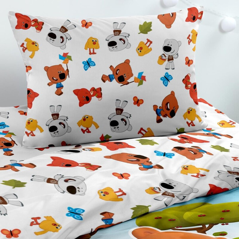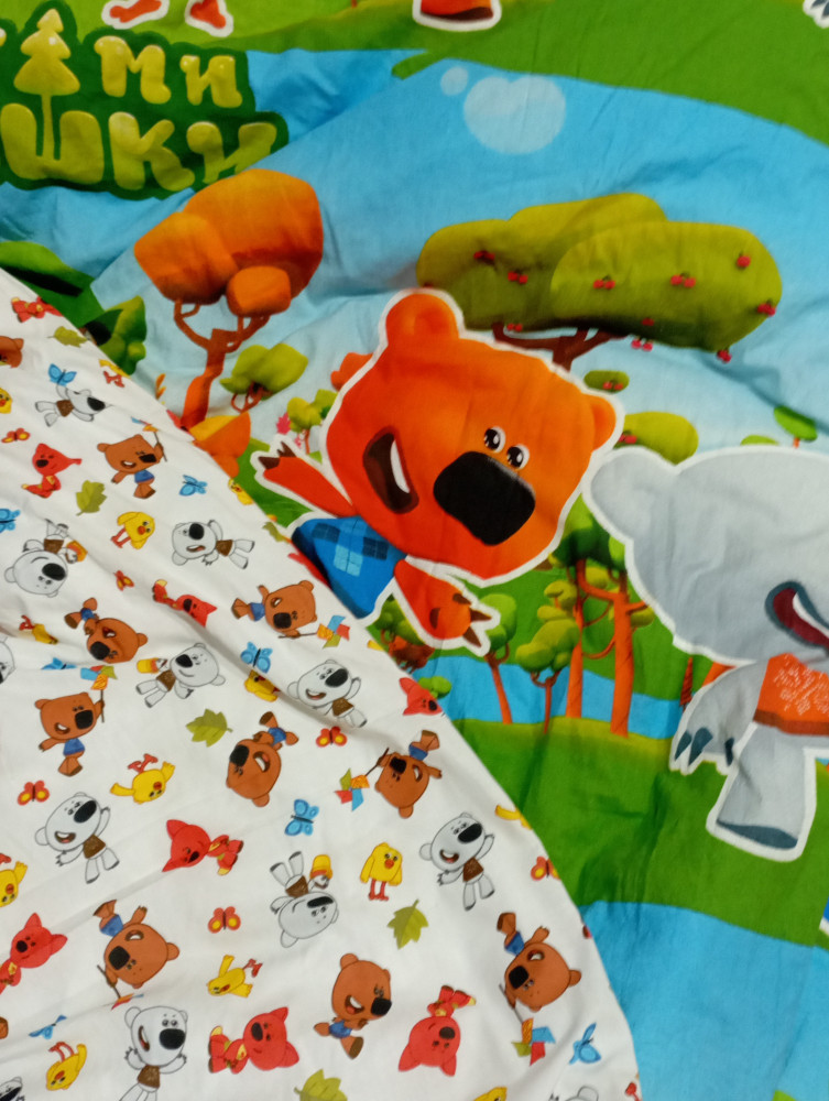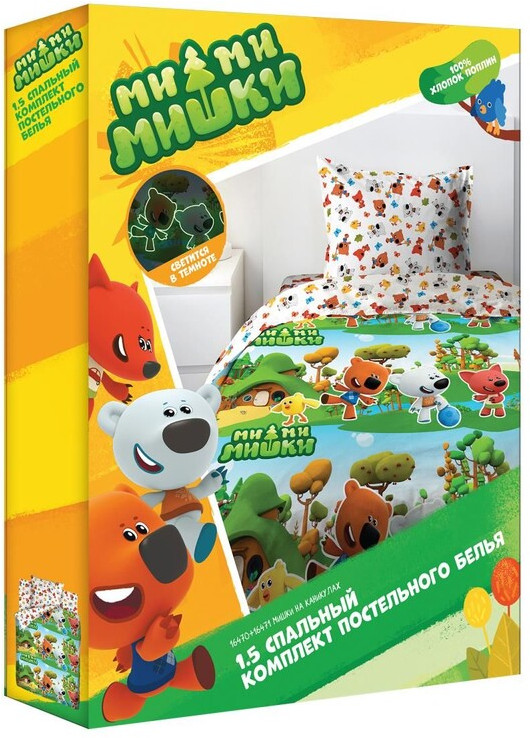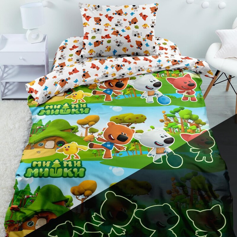 Красивая,яркая постель. Мягкая, простирчивая, цвет после стирки остаётся неизменным. Пододеяльник на отвороте с другим принтом как простыня и наволочка. Если не заправлять постель днём,то вечером после выключения света будут видны силуэты героев. Ребёнок доволен. Рекомендую!