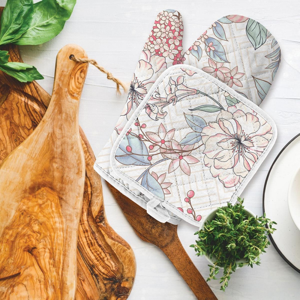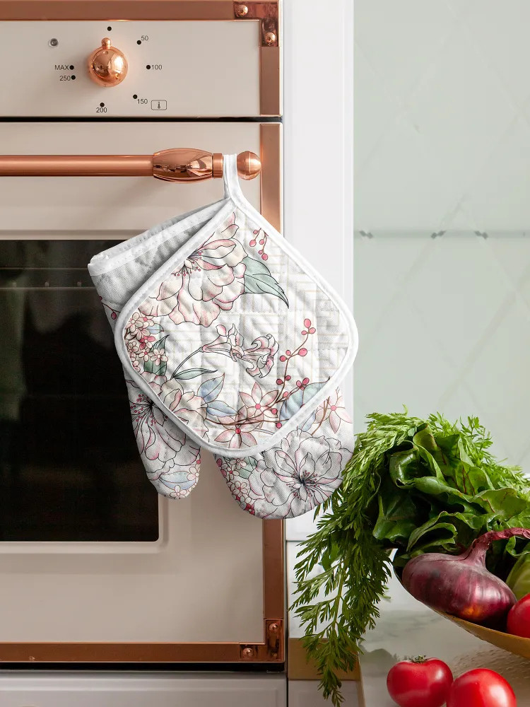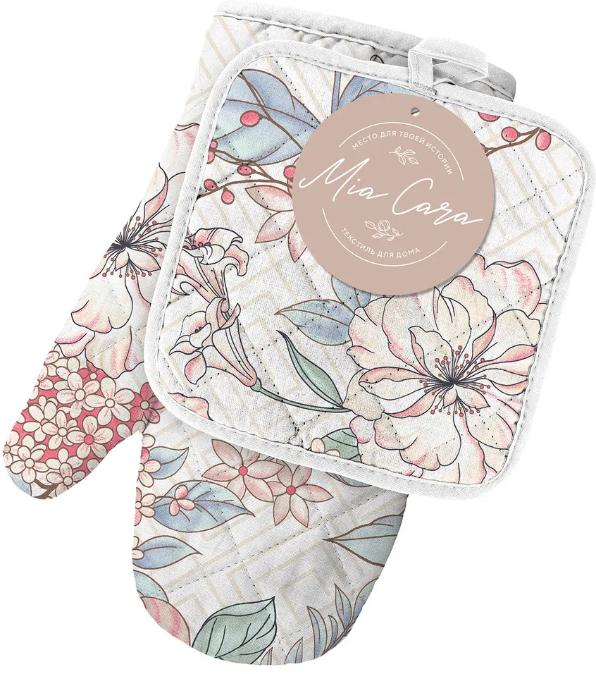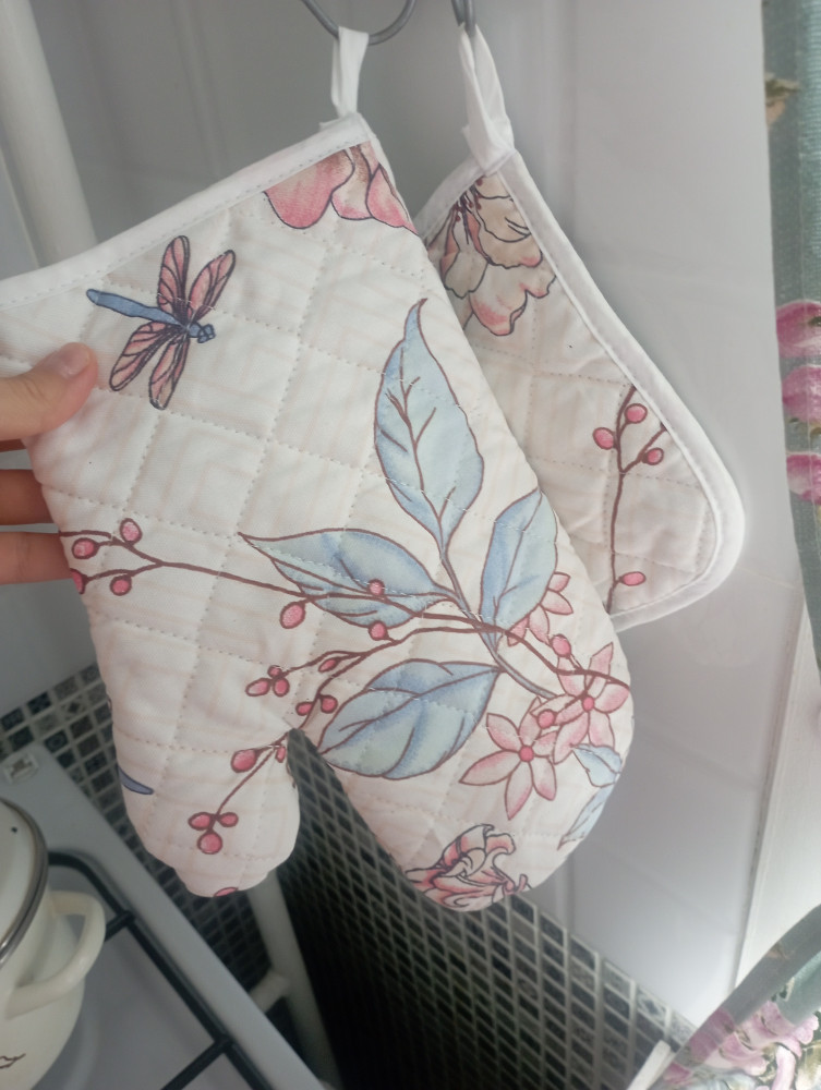 Ооочень классный набор: приятная плотная ткань отличного качества, нежный рисунок впишется в любой интерьер, прекрасно защищает от горячих поверхностей, удобная перчатка и прихватка, потому что тонкие, но плотные. Рекомендую!