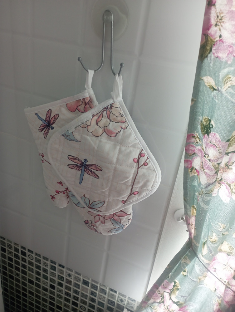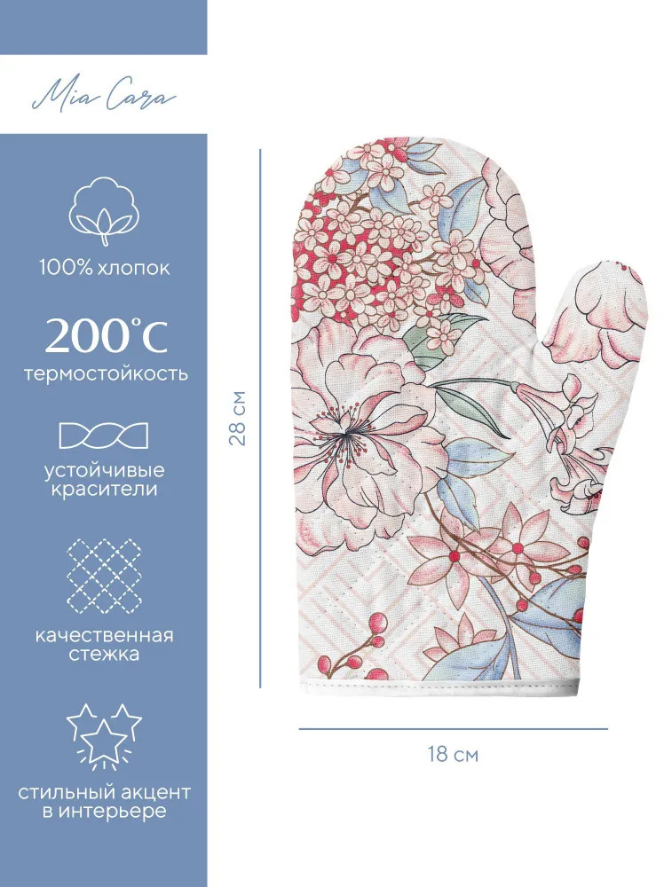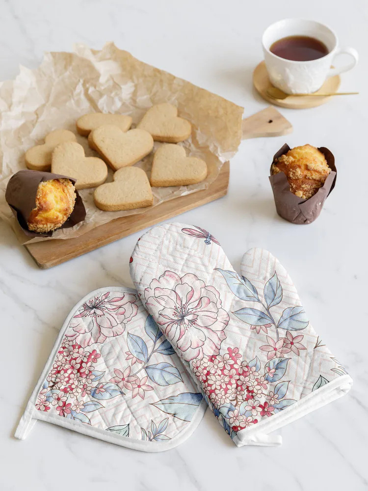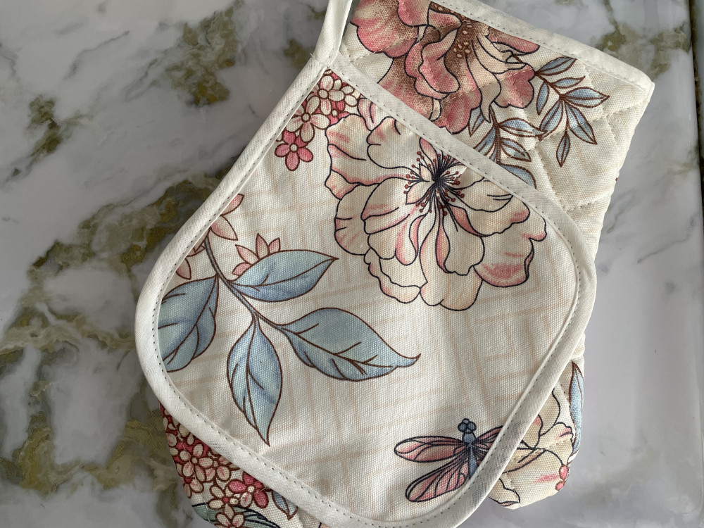 Ооочень классный набор: приятная плотная ткань отличного качества, нежный рисунок впишется в любой интерьер, прекрасно защищает от горячих поверхностей, удобная перчатка и прихватка, потому что тонкие, но плотные. Рекомендую!