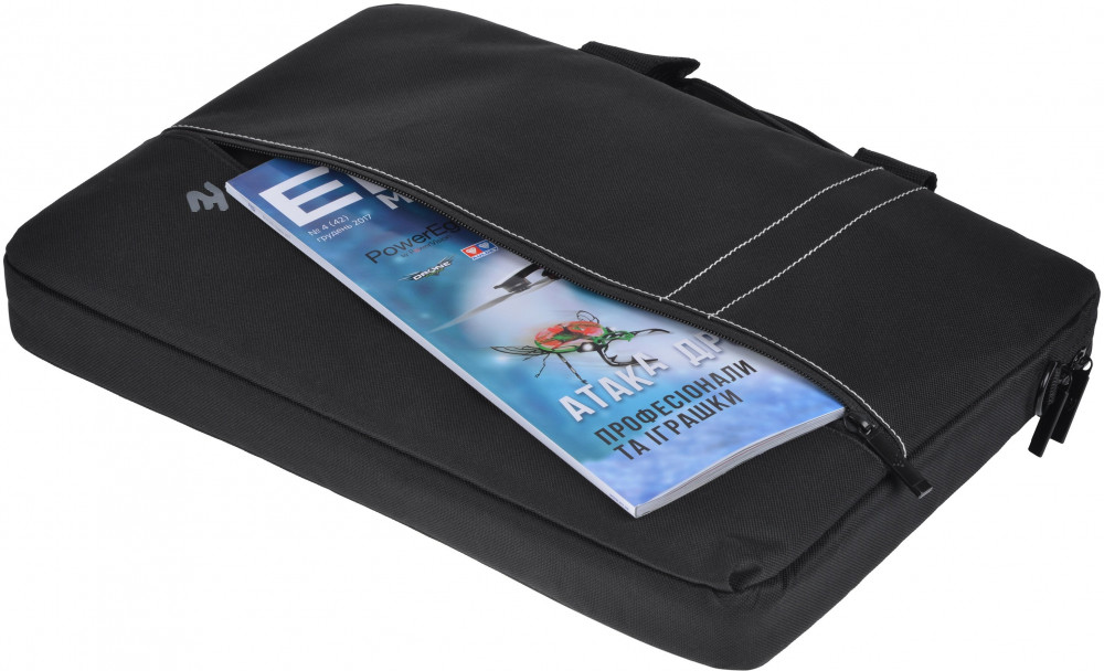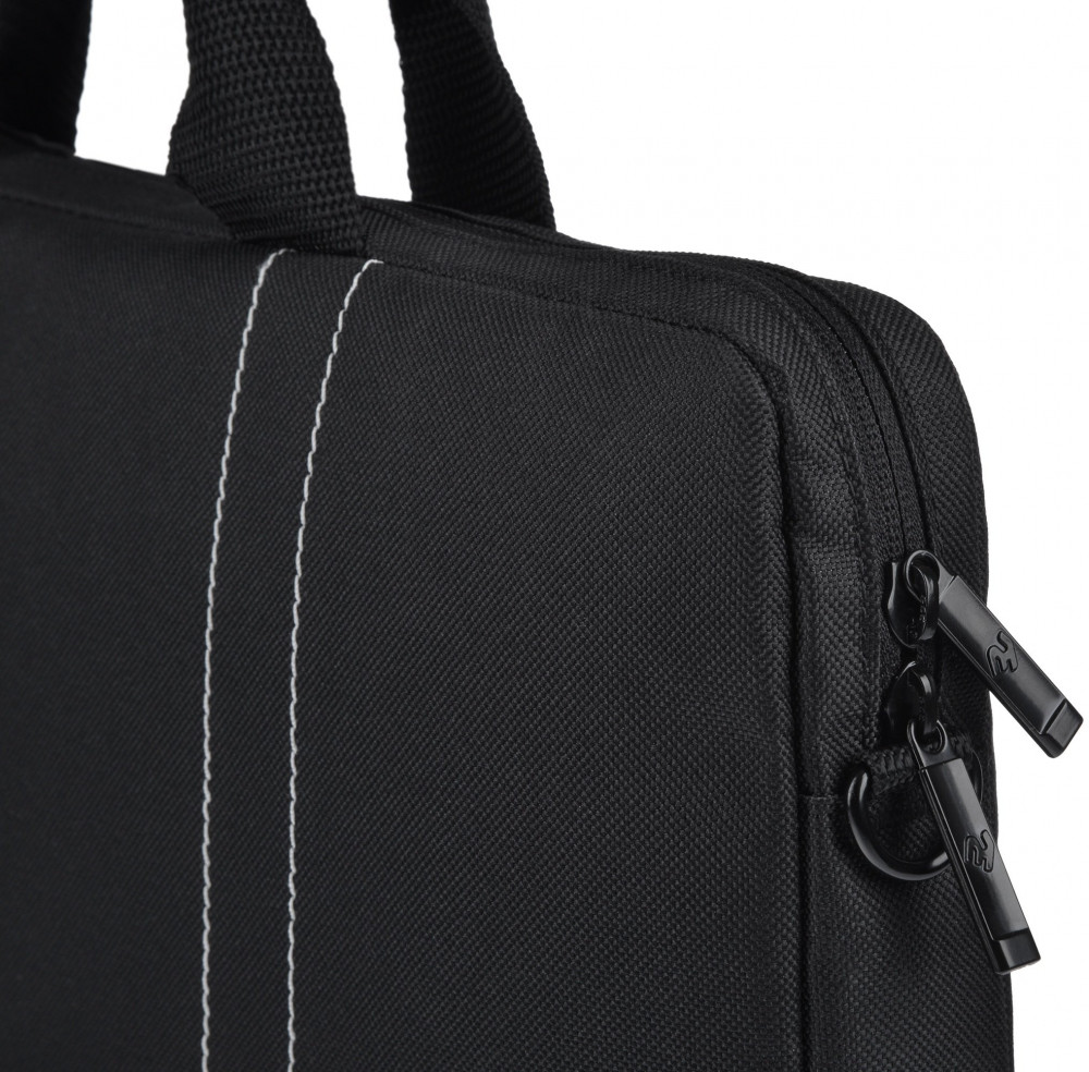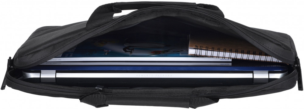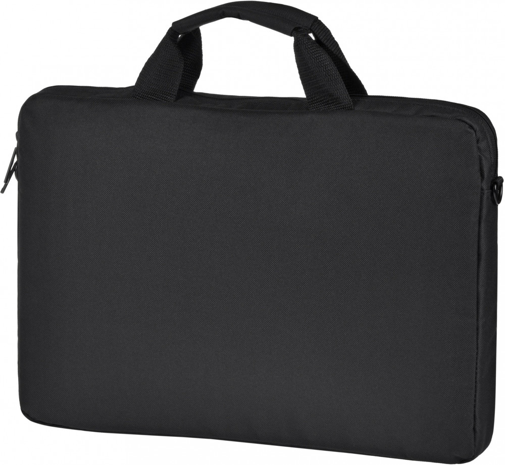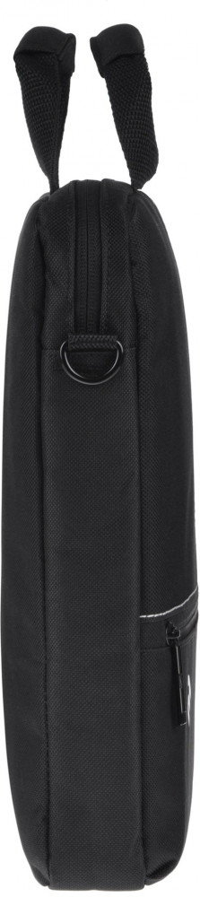 Сумка черного цвета для повседневного использования. Выполнена из водоотталкивающего нейлона в сочетании с материалом дна и стенок, который амортизирует толчки и удары. Помимо ноутбука, в ней можно разместить еще 1-2 журнала или папку с документами. На лицевой стороне сумки расположен внешний карман на молнии для блока питания и мышки. В комплект входит плечевой ремень с амортизирующей накладкой, регулирующийся по длине.