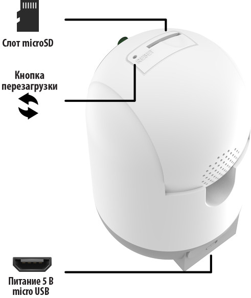 Питание камеры через micro USB порт от 5В, 1А. Кабель USB для подключения к питанию идет в комплекте. Используйте Вашу USB розетку или USB адаптер для подключения камеры к сети. Для временной автономной работы (например, на даче или в поездках) можно использовать как источник питания мобильное зарядное устройство (power bank).