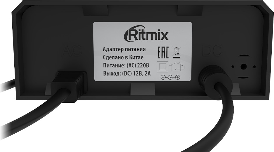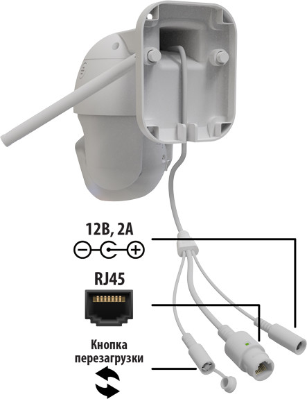 Питание камеры — DC 12В, 2А. Адаптер питания от сети 220В идёт в комплекте. Если Вам потребуется нарастить кабель питания от розетки до месторасположения камеры, это легко сделать самостоятельно кабелем питания нужной Вам длины с коннекторами DC Jack 5,5 мм х 2,1 мм.