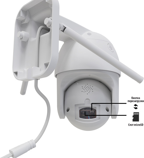 Камера наблюдения Ritmix IPC-277S имеет поворотные антенны, для уверенного приёма Wi-Fi сигнала от Вашего Wi-Fi роутера, а также разъём RJ45 для альтернативного сетевого подключения к интернету.