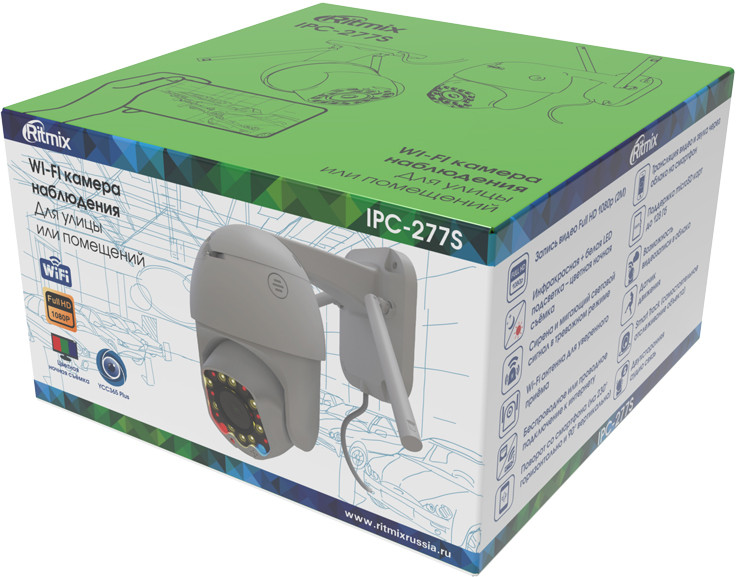 Ritmix IPC-277S — это современная полнофункциональная поворотная камера наблюдения в защищенном корпусе для улицы или для помещений. Может успешно использоваться для наблюдения за домом, подъездом, дачей, гаражом, двором, придомовой территории, детской площадкой и т.д. Обеспечивает цветную ночную видеосъёмку. Имеет и встроенный модуль Wi-Fi, и возможность проводного подключения к интернет-сети через разъём RJ45 (10/100M). Видеозапись ведётся на карту памяти (micro SD, до 128 Гб) или в облачное хранилище (по выбору пользователя) в разрешении Full HD 1080p непрерывно либо короткими файлами при обнаружении движения PIR датчиком камеры.