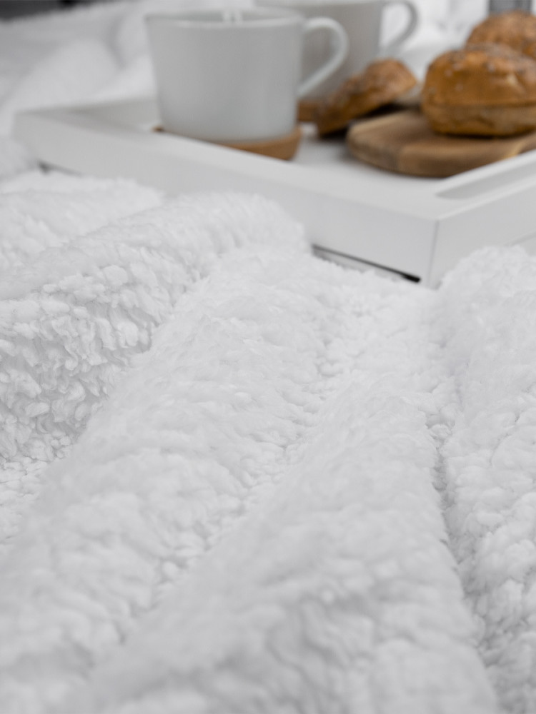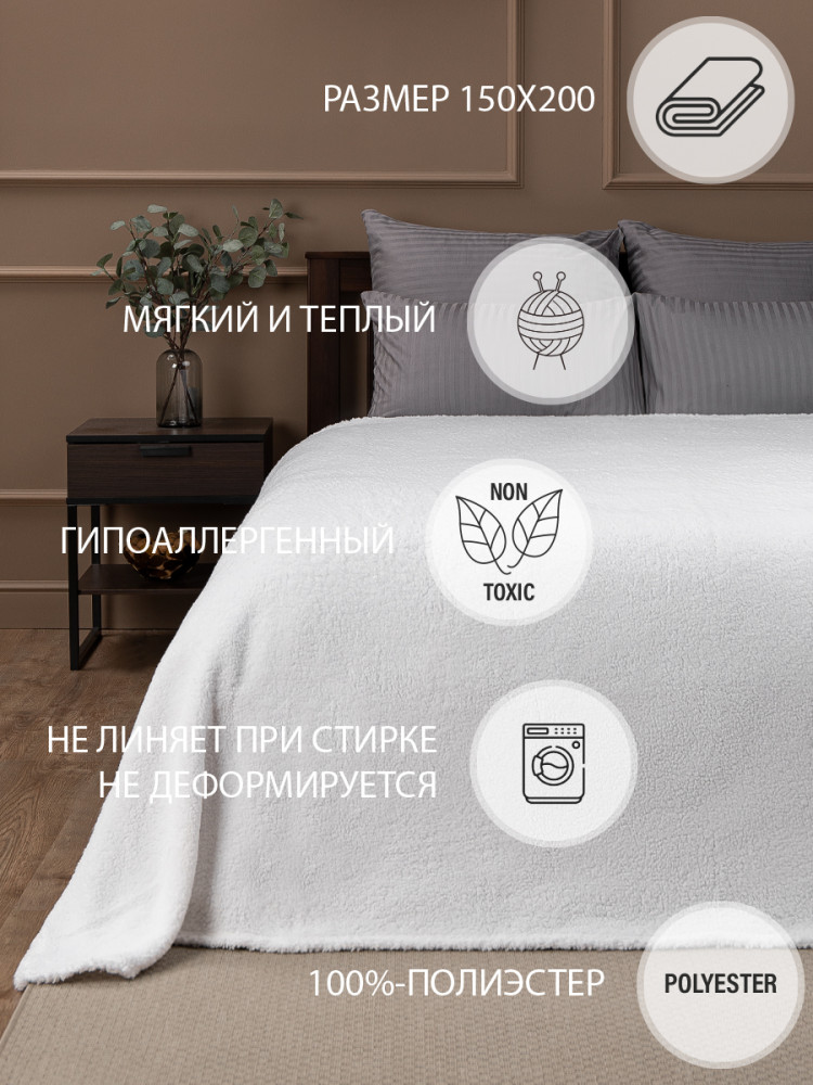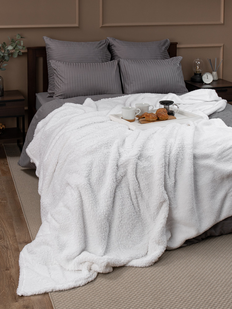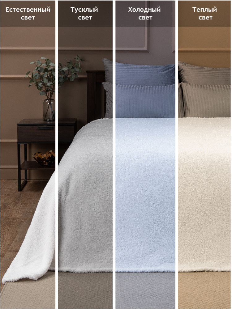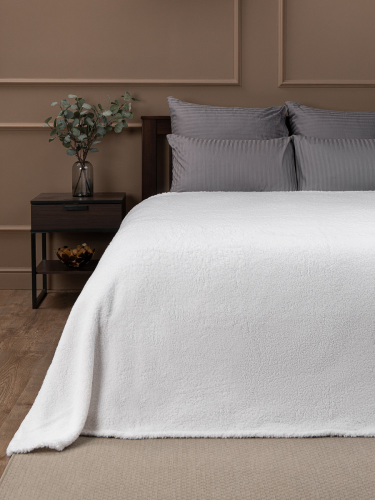 Плед выполнен из искусственного меха, его ворс имитирует мех овчину, имеет мягкую и приятную на ощупь текстуру с достаточно коротким ворсом. Благодаря однотонной расцветке он подойдет к любому интерьеру и будет сочетается с любым постельным бельем.