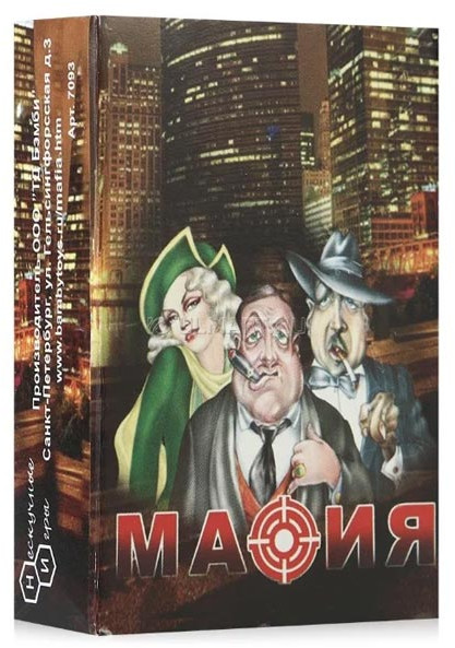 Нескучные игры Карты игральные «Мафия»В данный момент этот товар отсутствует в продаже. Возможно, у нас найдется аналогичный или похожий товар здесь. Мафия — настольная ролевая игра. Разделена на 2 периода — день и ночь. Днем мирные жители вычисляют мафию, а ночью мафия убивает мирного жителя. Причем мафия по правилам знает друг друга, а мирные жители нет. Этим и интересна игра, что большинство не знает, кто есть кто. За игрой Мафия следит ведущий, чтобы все было по правилам. Каждый герой выбирает своего персонажа случайным образом, вытягивая карту из колоды. Эта игра не только настольная, но и дорожная, так как нужны только карты для игры в Мафию и что-нибудь, чем можно хорошо закрыть глаза ночью, чтобы предотвратить подглядывание, зачем и должен следить человек, вытянувший карту Ведущий. |