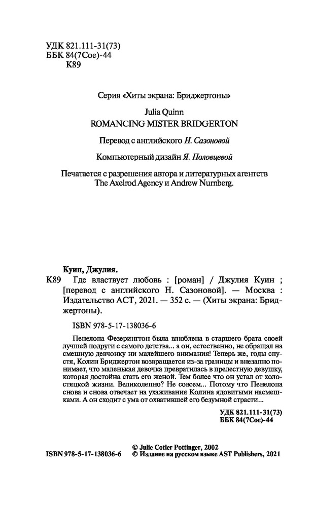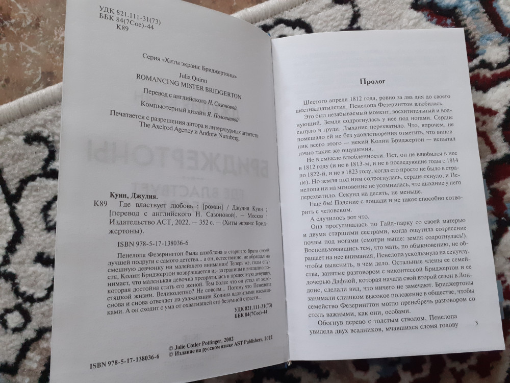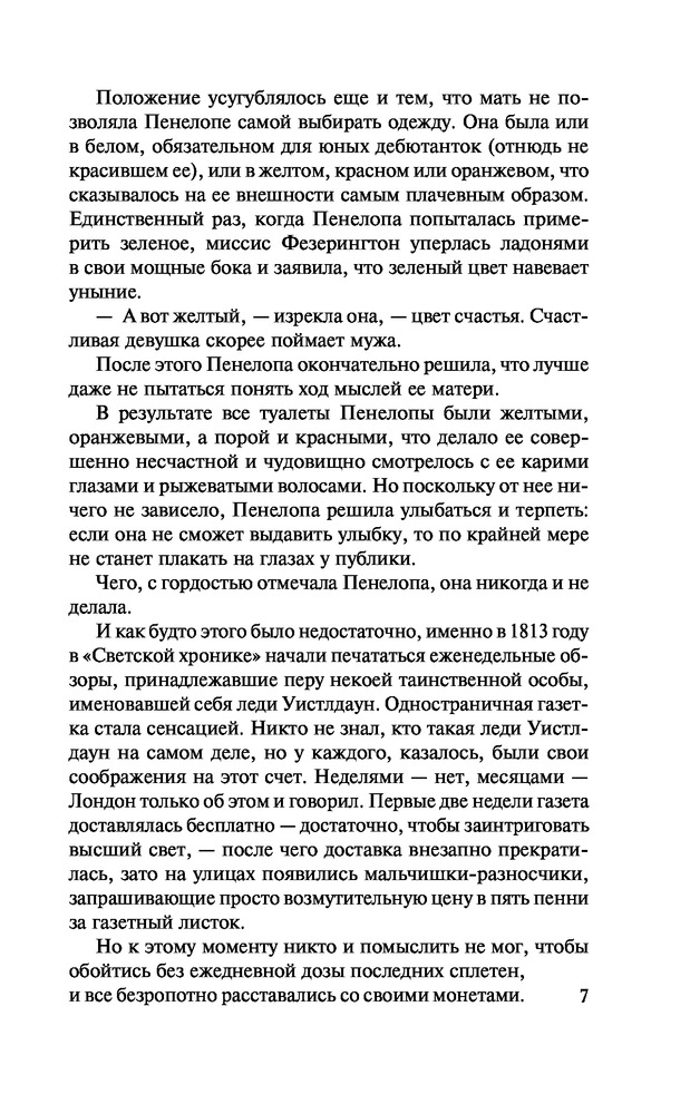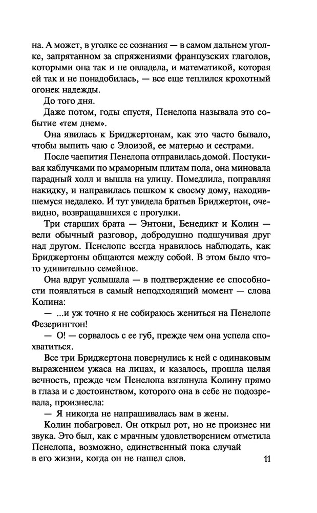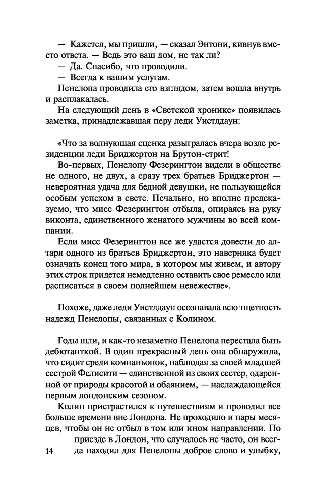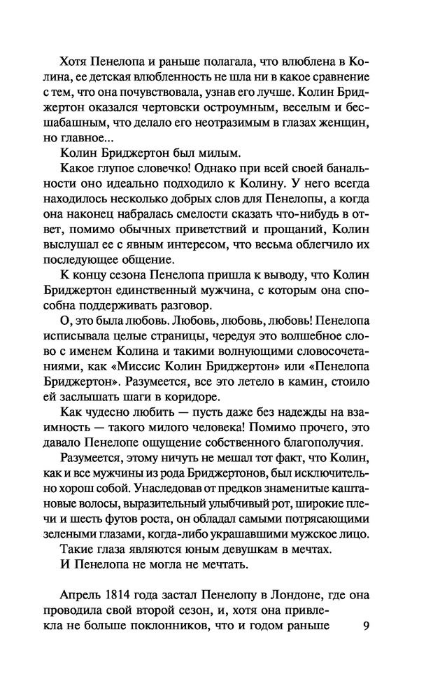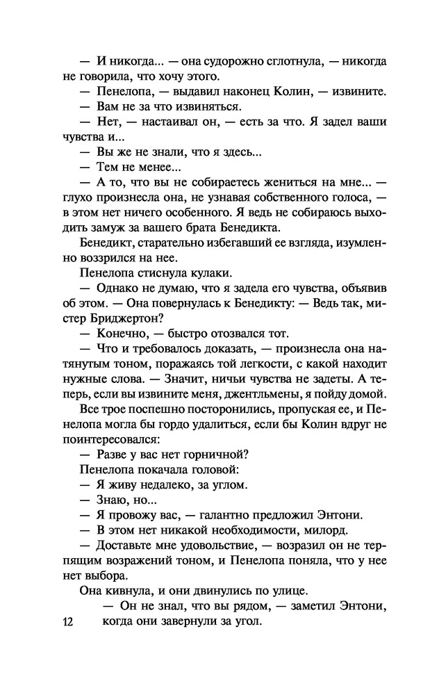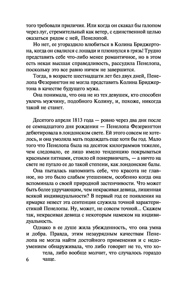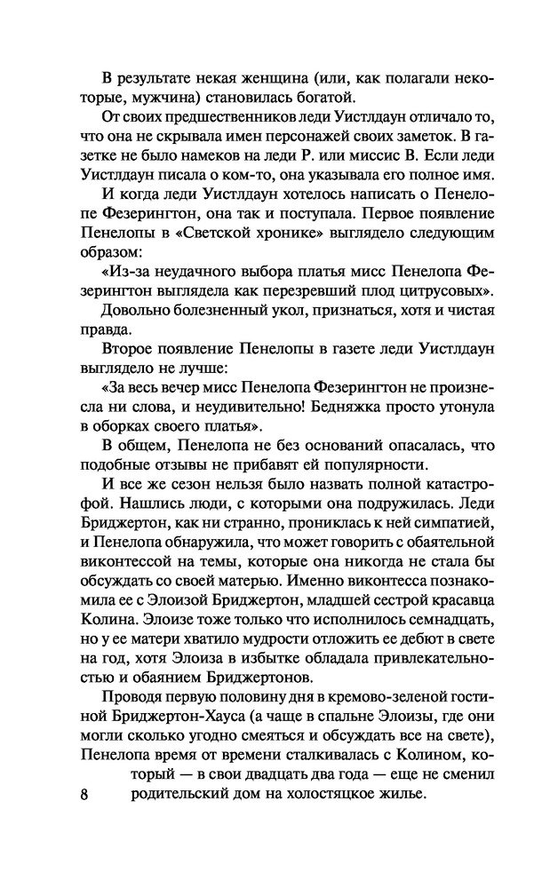 Очень понравился роман, сказать честно ранние книги не читала и сразу купила этот так как слышала что 3 сезон сериала будет именно про Пенелопу и Колина. Разумеется есть отличия от сериала, но мне лично это никак не помешало. Немножко сомневалась понравится мне повествование в книжном варианте или нет, но мне всё понравилось. Заместительный роман рада что всё же решилась её приобрести Дальше спойлер! Читая аннотацию думала что Колин и вправду буде добиваться Пенелопу, будет всячески ухаживать за ней но ничего подобного. Она же сразу согласилась на брак с ним, не о каком либо ухаживание и ответа на них от неё с насмешками не было. Так что описанием не совсем соответствует действительности, но если не обращать внимание на это всё просто замечательно