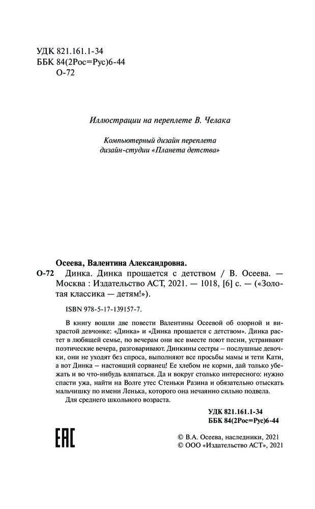 💳 Оплатить за товар можно при получении 🇰🇿 Есть бесплатная доставка по Казахстану 🎁 Копите бонусы с каждой покупки Серия: Золотая классика — детям! В книгу вошли две повести Валентины Осеевой об озорной и вихрастой девчонке: «Динка» и «Динка прощается с детством». Динка растет в любящей семье, по вечерам они все вместе поют песни, устраивают поэтические вечера, разговаривают. Динкины сестры — послушные девочки, они не уходят без спроса, выполняют все просьбы мамы и тети Кати, а вот Динка — настоящий сорванец! Ее хлебом не корми, дай только убежать и во что-нибудь вляпаться. Да и вокруг столько интересного: нужно спасти ужа, найти на Волге утес Стеньки Разина и обязательно отыскать мальчишку по имени Ленька, которого она нечаянно сильно подвела. |