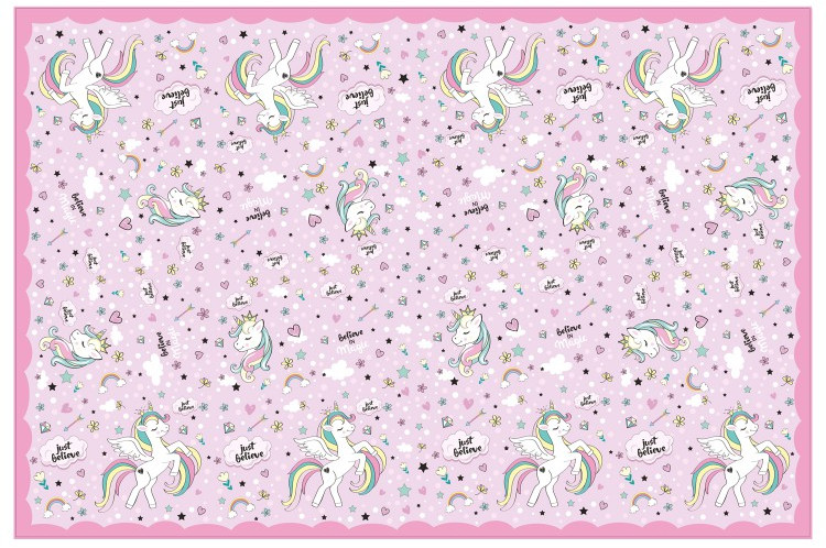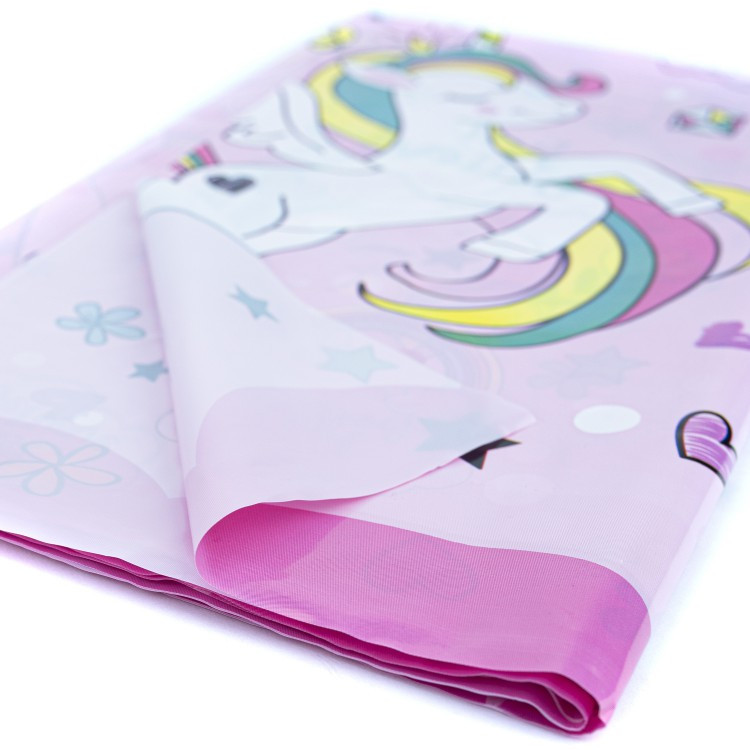 Полиэтиленовая скатерть не пропускает воду, поэтому не бойтесь замочить ее дождем или сладким напитком — такая скатерть быстро очищается с помощью губки или тряпочки. Скатерть «Единорог» предназначена для сервировки стола и холодных пищевых продуктов.