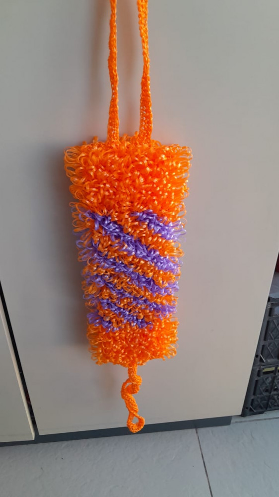 очень приятная мочалка получается. Соединила 2 моточка, белый и оранжевый. Получилась мочалка 40*15 основное полотно и по 35 см ручки в сложенном виде.