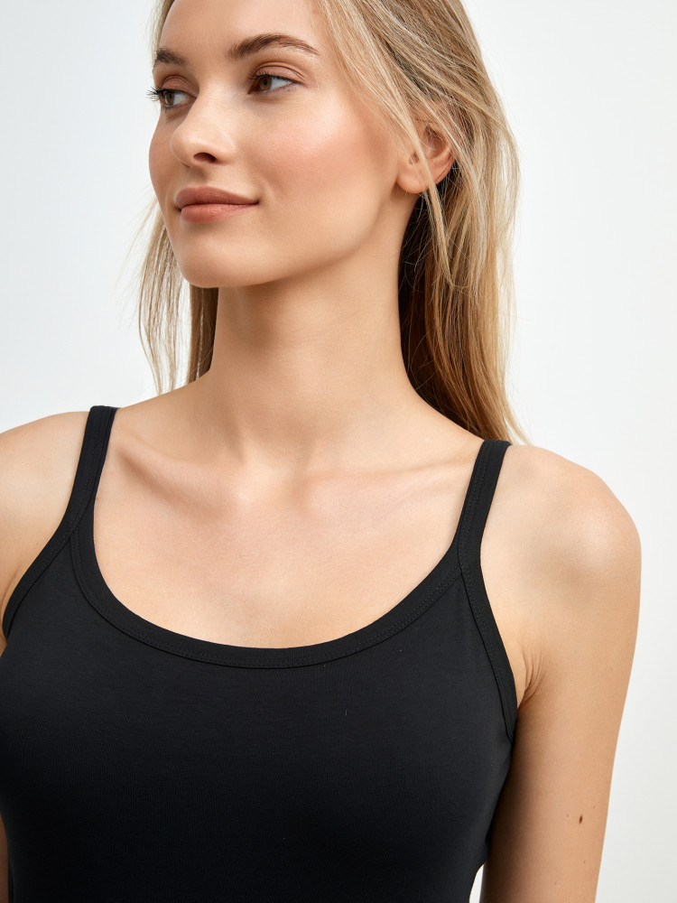 Хорошая базовая майка. Брала свой размер 44, цвет чёрный. Сидит хорошо, но малость коротковата. Со скидкой брать вообще хорошо 👍