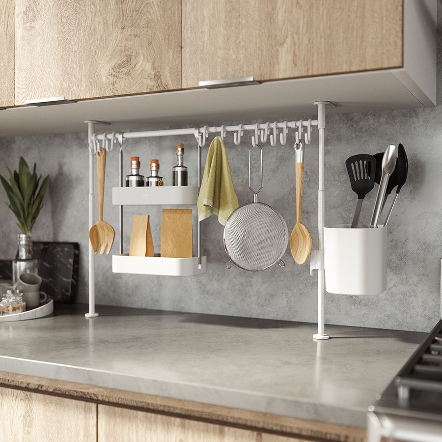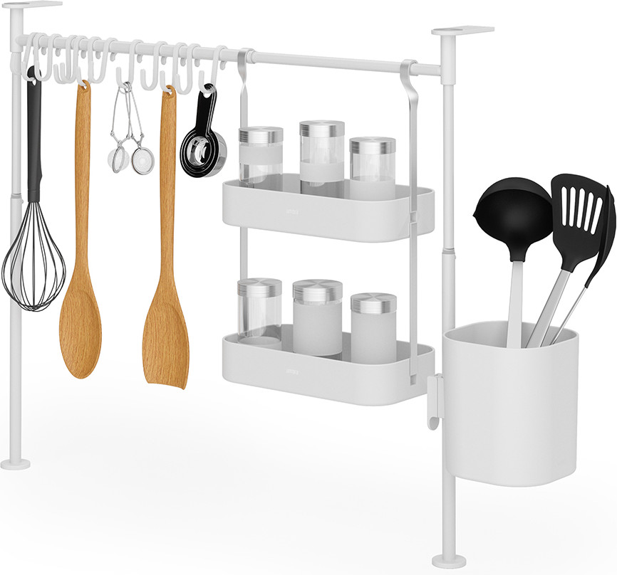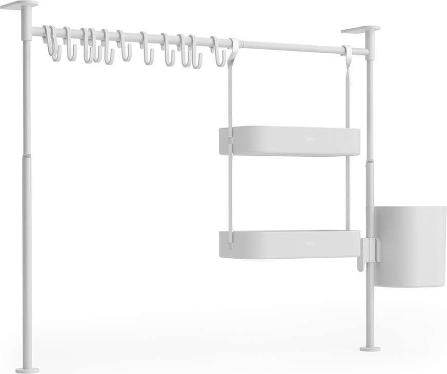 Umbra Органайзер кухонный «Anywhere»В данный момент этот товар отсутствует в продаже. Возможно, у нас найдется аналогичный или похожий товар здесь. Серия: Anywhere Органайзер поможет навести порядок на кухне, в ванной или на рабочем столе. Многофункциональный органайзер оснащен двенадцатью подвесными крючками, подвесным контейнером и двумя полочками. Конструкция легко раздвигается без инструментов. Органайзер раздвигается от 38 до 50 см в высоту и от 39 до 61 см в ширину. Мягкие накладки защищают мебель от повреждений. |
