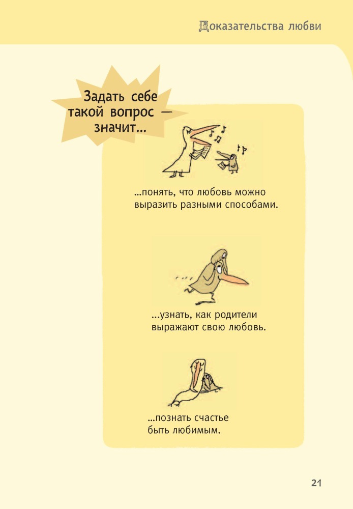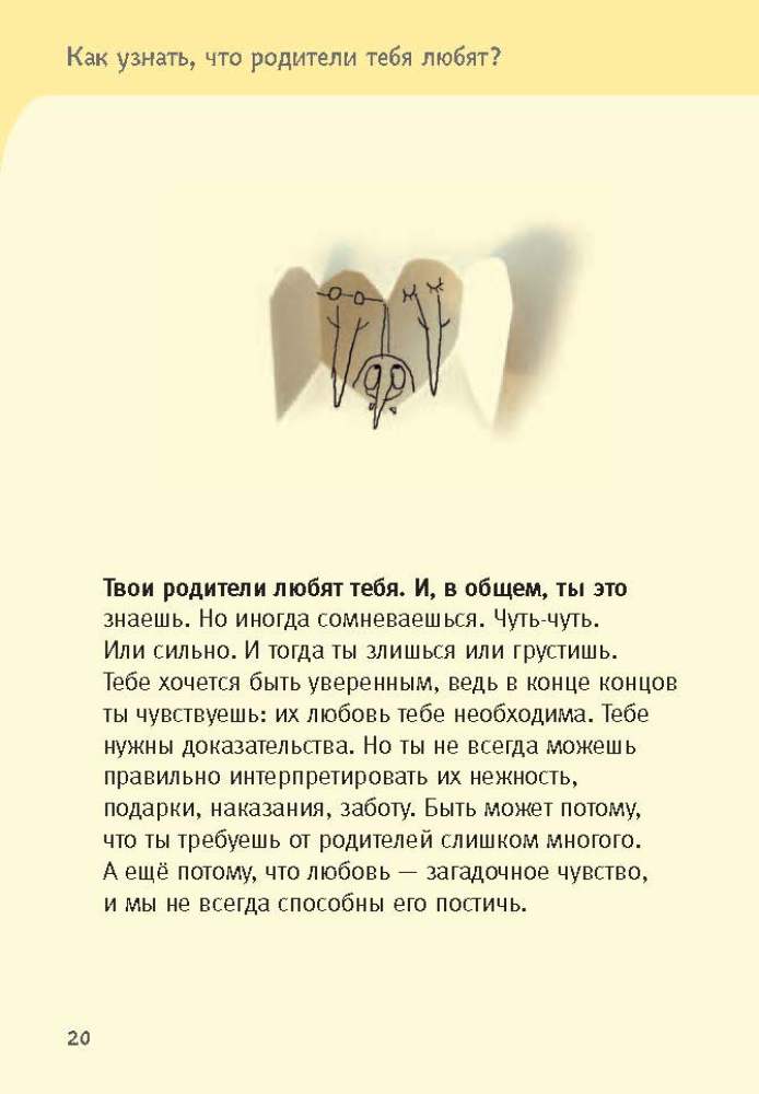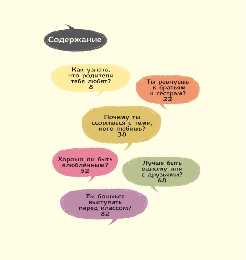 Книга помогает родителям задавать "правильные" вопросы детям. И вместе разбираться в таких чувствах как любовь, ревность. Отвечать на вопросы. Как узнать, что родители тебя любят? Почему ты ссоришься с теми, кого любишь? Ты ревнуешь к братьям и сёстрам? Хорошо ли быть влюбленным? Лучше быть одному или с друзьями? Ты боишься выступать перед классом?