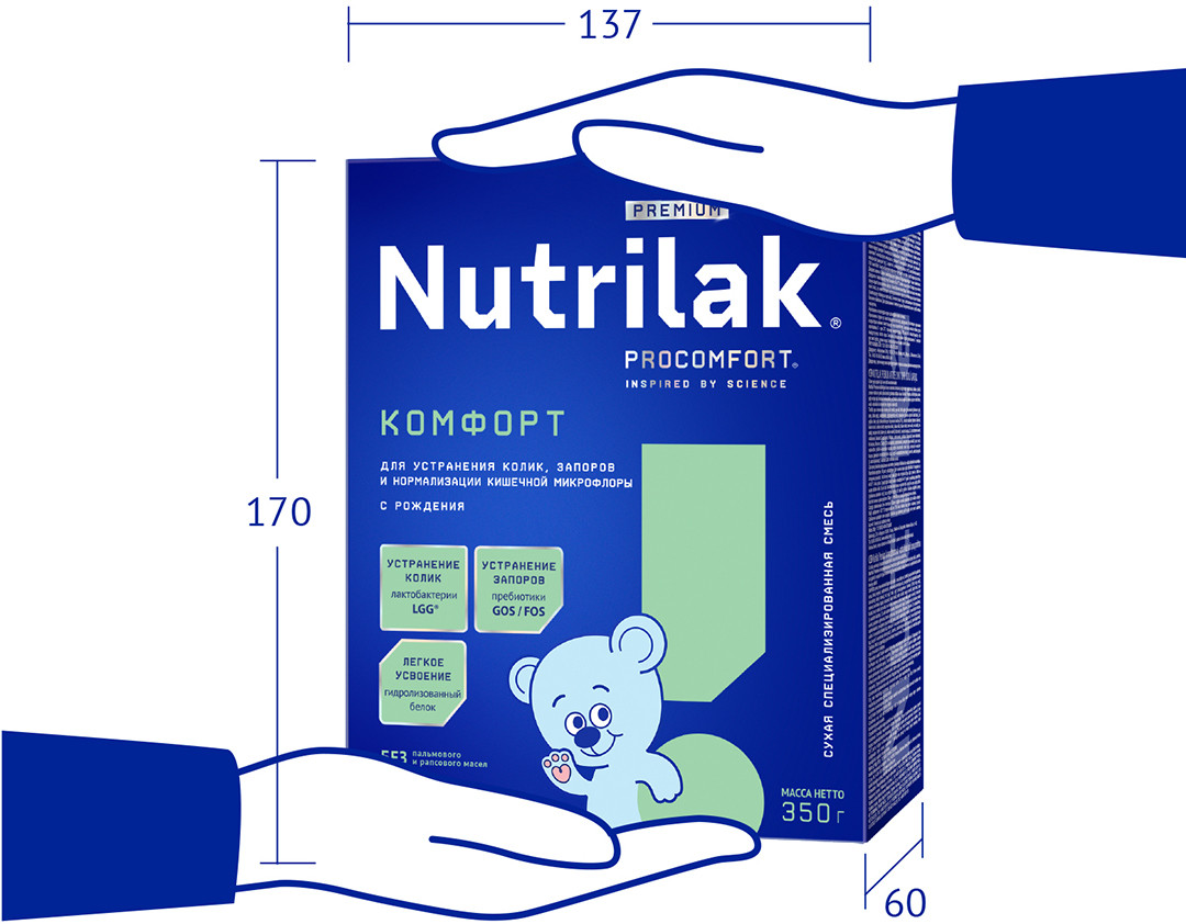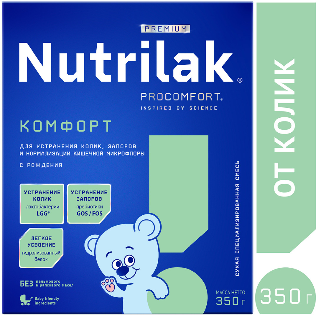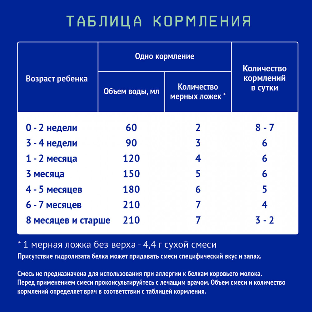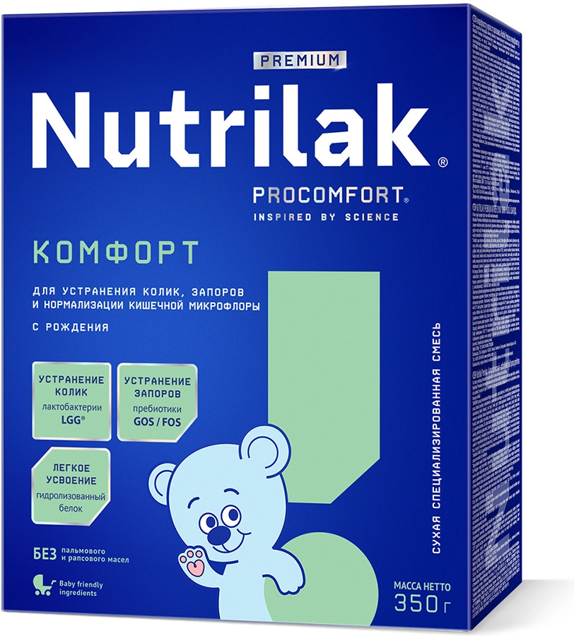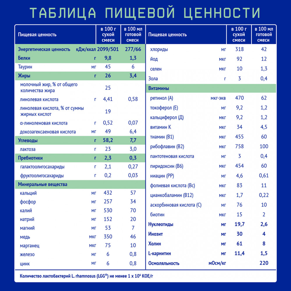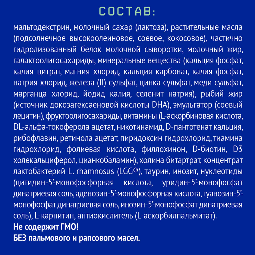 мальтодекстрин, молочный сахар (лактоза), растительные масла (подсолнечное высокоолеиновое, соевое, кокосовое), частично гидролизованный белок молочной сыворотки, молочный жир, кукурузный крахмал, галактоолигосахариды, эмульгаторы (эфиры глицерина и лимонной кислоты и жирных кислот, моно- и диглицериды жирных кислот), минеральные вещества (кальция фосфат, калия фосфат, кальция карбонат, магния хлорид, калия хлорид, натрия хлорид, железа (II) сульфат, цинка сульфат, меди сульфат, марганца хлорид, йодид калия, селенит натрия), рыбий жир (источник докозагексаеновой кислоты DHA), фруктоолигосахариды, витамины (L-аскорбиновая кислота, DL-альфа-токоферола ацетат, никотинамид, D-пантотенат кальция, рибофлавин, ретинола ацетат, пиридоксин гидрохлорид, тиамина гидрохлорид, фолиевая кислота, филлохинон, D-биотин, D3 холекальциферол, цианкобаламин), холина битартрат, концентрат лактобактерий L. rhamnosus (LGG), таурин, инозит, нуклеотиды (цитидин-5’-монофосфорная кислота, уридин-5’- монофосфат динатриевая соль, аденозин-5’-монофосфорная кислота, гуанозин-5’-монофосфат динатриевая соль, инозин-5’- монофосфат динатриевая соль), L-карнитин, антиокислитель (Lаскорбилпальмитат).