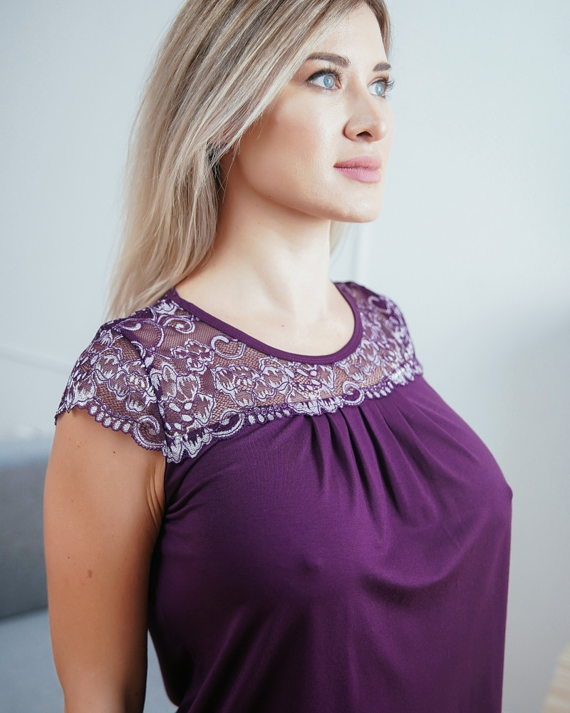 Комплект женский для дома и отдыха. Выполнен комплект из нежной, мягкой вискозы. Футболка свободного кроя, с элегантной сборкой в области груди, вырез круглый. Вверх футболки сделан из эластичного кружева, переходящее в спинку и короткие рукава. Брюки-бриджи на эластичной резинке, свободного кроя.