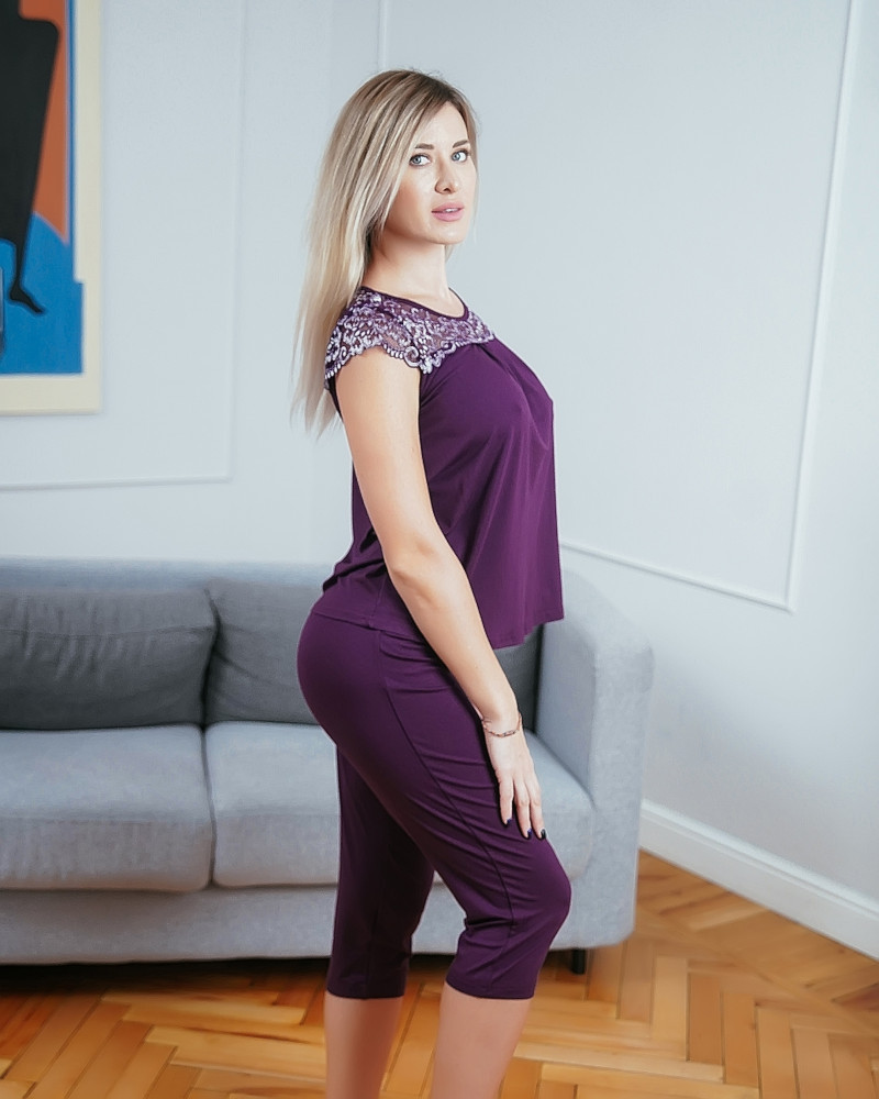 Комплект отличный : мягонький, удобный, кружева тоже не колятся. Взяла на размер больше и не пожалела- очень удобно, нигде не давит. Качественно пошит - нитки не торчат и не распускаются. Можно носить как домашнюю одежду или как пижаму. Цвет бордовый. Брала по скидке, что вдвойне приятно. К покупке очень рекомендую. Если будет в наличии синий моего размера, то обязательно закажу ещё один комплект.