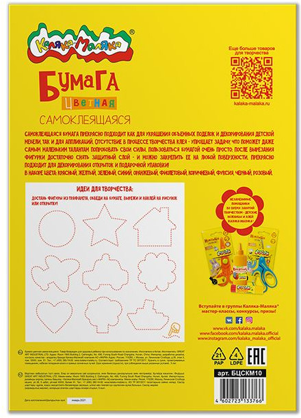 Каляка-Маляка Бумага цветная самоклеящаяся+54