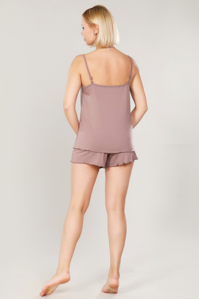 Пижама из вискозы состоит из майки на тонких бретелях и шортиков. Шорты на широкой мягкой резинке. Пижама декорирована кружевом. Идеальный вариант не только для сна, но и для домашнего отдыха.