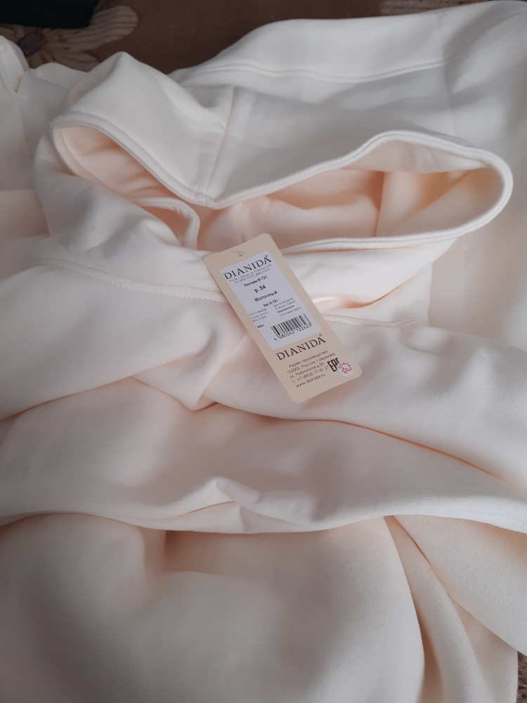 Цвет отливает в персиковый, брала 54 подошёл на 56. Мягкий, но синтетика. Думала будет молочного цвета.