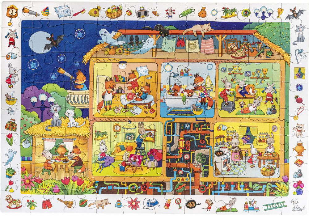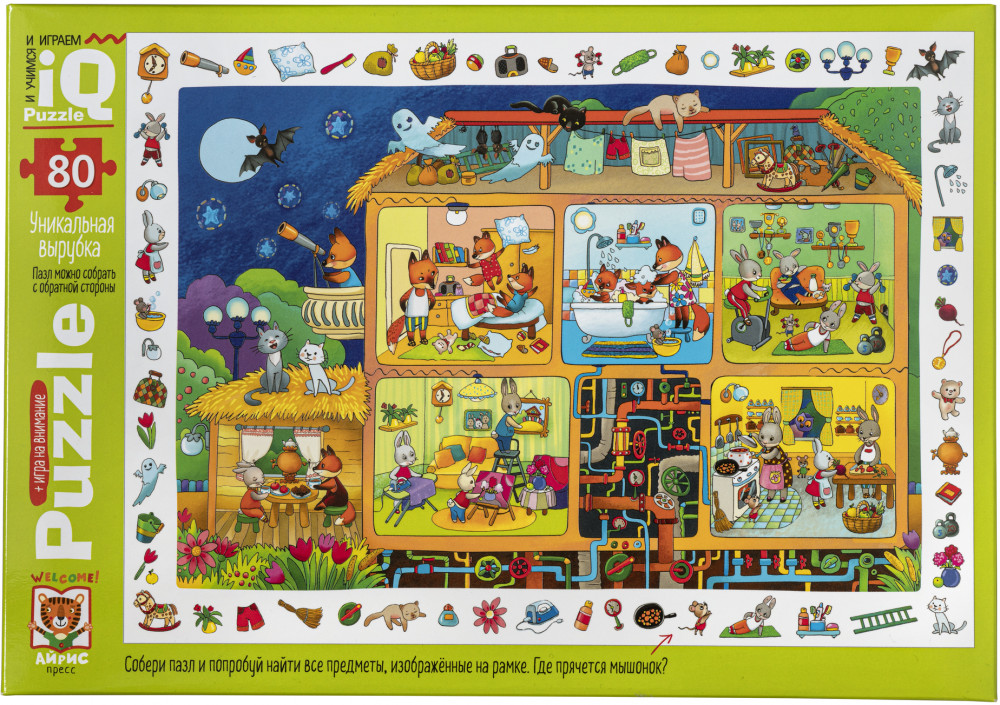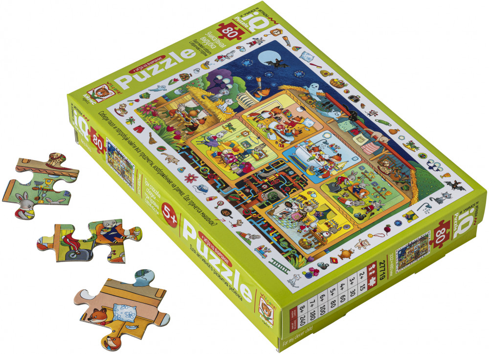 В коробке 80 деталей, которые складываются в картинку с изображением сказочного домика и его обитателей — забавных животных. Но соотнести элементы друг с другом и собрать рисунок — это только полдела. Когда пазл будет готов, попросите ребёнка найти на рисунке предметы, расположенные в рамке по контуру — такая игра на внимание понравится и самым маленьким детям, и ребятам постарше.