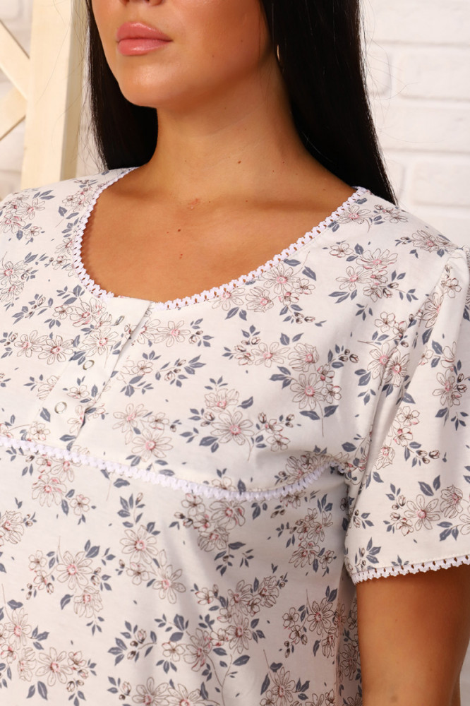Обычная сорочка с миленьким узорчиком.Единственное, на фото: на девушке она длиной ниже колена, у меня, видимо, рост другой -не совпала с фото.На этикетке указан только размер.