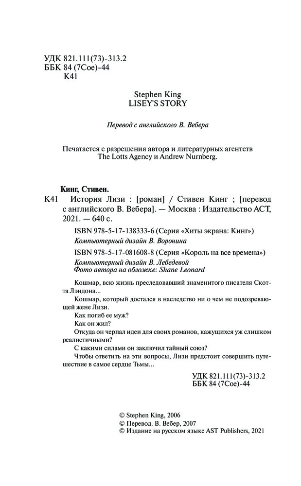 В данный момент этот товар отсутствует в продаже. Возможно, у нас найдется аналогичный или похожий товар здесь. Серия: Хиты экрана: Кинг Кошмар, всю жизнь преследовавший знаменитого писателя Скотта Лэндона... Кошмар, который достался в наследство ни о чем не подозревающей жене Лизи. Как погиб ее муж? Как он жил? Откуда он черпал идеи для своих романов, кажущихся уж слишком реалистичными? С какими силами он заключил тайный союз? Чтобы ответить на эти вопросы, Лизи предстоит совершить путешествие в самое сердце Тьмы... |