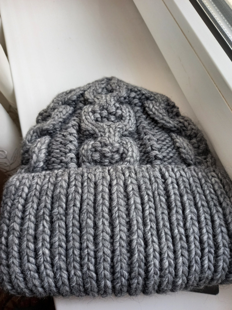 Очень понравилась шапочка. Крупная вязка, посадка удобная, глубокая, поправлять не надо, надела - забыла. У кого длинные волосы, улягутся спокойно. Бежевый - это теплый серый, мне очень зашел.