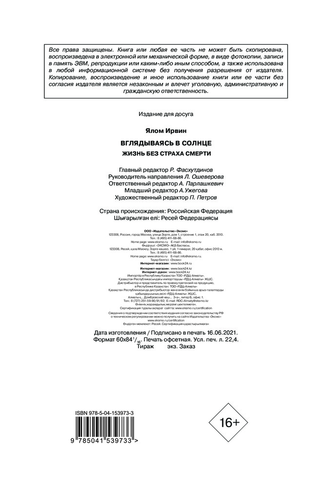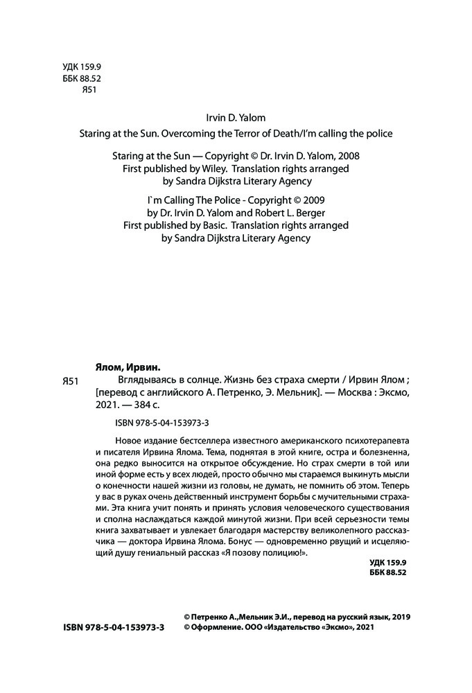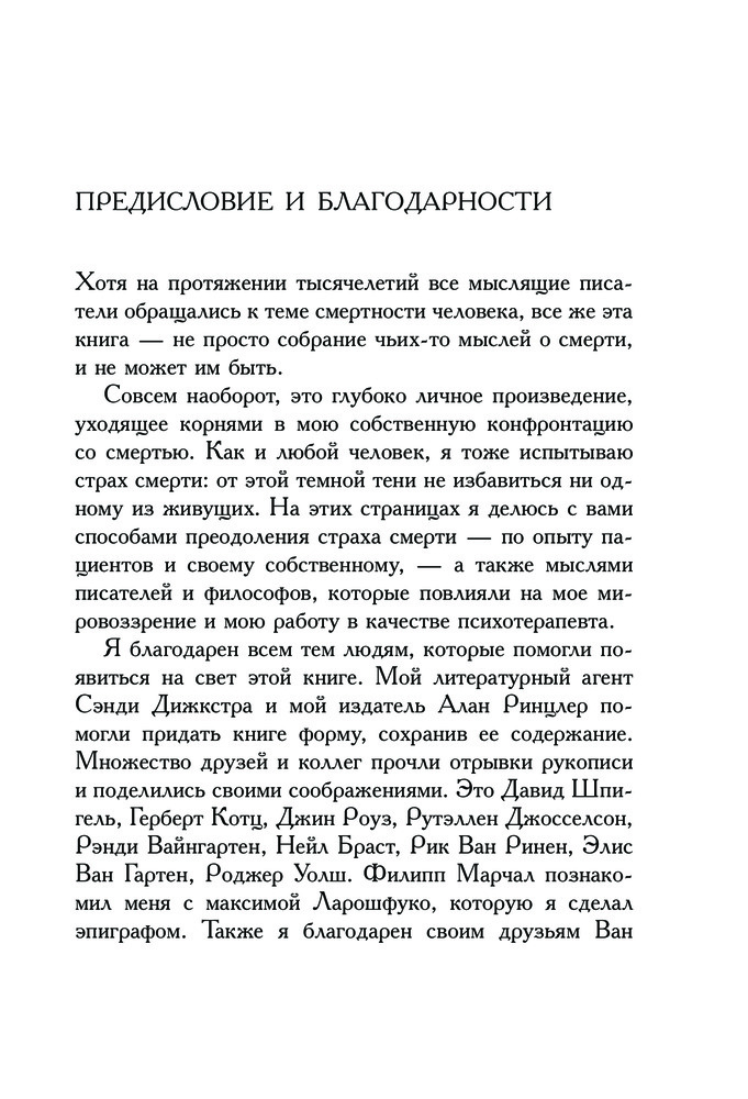 Книга в мягкой обложки. Оформление красивое. На счёт самой книги, очень известный психотерапевт. Книга понравилась, интересно и легко читать. Я только начала читать, пока тема смерти для меня в этой книги не совсем раскрыта. Но уже сейчас есть над чем подумать…. Купила ее не из за страха смерти, скорее из за своего личностного кризиса. Так как мне показалась эти темы могут перекликаться…. В общем советую к прочтению.