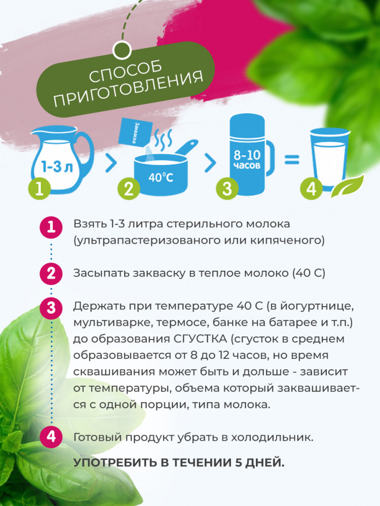 Очень понравилась закваска. Продукт получается густой как йогурт, с очень нежным молочным вкусом. Покупала первый раз, боялась что будет кислый продукт, но совсем нет, повторюсь нежный отличный на вкус получается. Делала из трех разных марок молока. Адал 6% долгого хранения которое в тетрапаке все отлично получилось. Jls. 3,2 процента срок хранения молока 5 дней - тоже отлично все получилось. И из беларусского молока долгого хранения тоже 👍. Больше всего понравился вкус из Адал 6%.. Делала в мультиварке на режиме йогурт. У кого нет такого режима можно выставить любую программу на 8 часов и температуру 40 градусов. И да, важно, вводить закваску нужно в теплое молоко, не в холодное. В общем продукт отличный, заказала теперь эту закваску в большой пачке где 20 порций. Детям тоже очень понравилось, магазинный йогурт теперь не хотят есть. А самое главное что там несколько штаммов полезных лактобактерий которые оживаю при закваске и потом отлично восстанавливают микробиоту кишечника!
