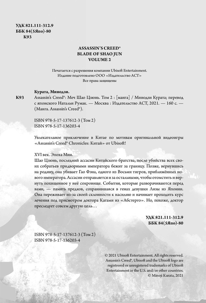 Assassin's Creed. Меч Шао Цзюнь. Том 2В данный момент этот товар отсутствует в продаже. Возможно, у нас найдется аналогичный или похожий товар здесь. Серия: Манга. Assassin's Creed XVI век. Эпоха Мин. Шао Цзюнь, последний ассасин Китайского братства, после убийства всех своих собратьев придворными императора бежит за границу. Позже, вернувшись на родину, она убивает Гао Фэна, одного из Восьми тигров, приближённых нового императора. Ассасин отправляется и за остальными, чтобы отомстить и вернуть похищенное у неё сокровище. События, которые разворачиваются перед вами, — память предков, сохранившаяся в генах девушки Лизы из Японии. Она переживает из-за своей склонности к насилию и начинает проходить курс лечения под присмотром доктора Кагами из «Абстерго». Но, похоже, доктор преследует совсем другую цель... |