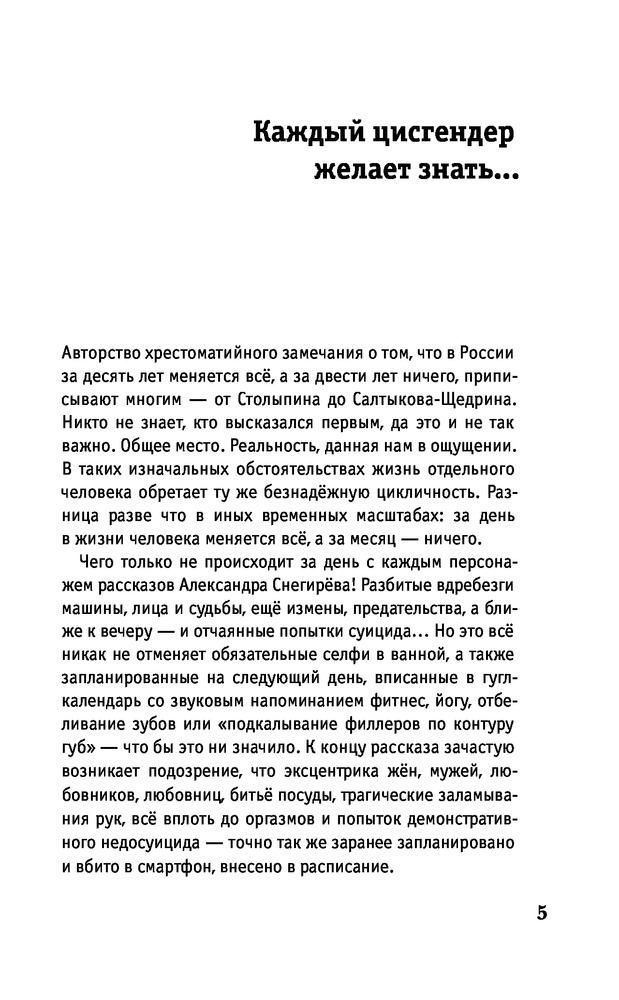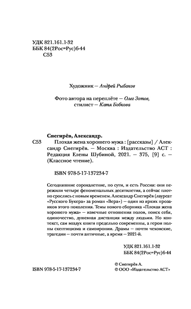 Серия: Классное чтение Сегодняшние сорокалетние, по сути, и есть Россия: они пережили четыре феноменальных десятилетия, а сейчас плотно срослись с новым временем. Александр Снегирёв (лауреат «Русского Букера» за роман «Вера») — один из ярких прозаиков этого поколения. Темы нового сборника «Плохая жена хорошего мужа» — извечные отношения полов, поиск себя, одиночество, душевная дистанция между людьми. Но контекст, сам воздух книги предельно современны, а герои полны скептицизма и самоиронии. Драмы — почти чеховские, трагедии — почти античные, а время — 2021-й. |