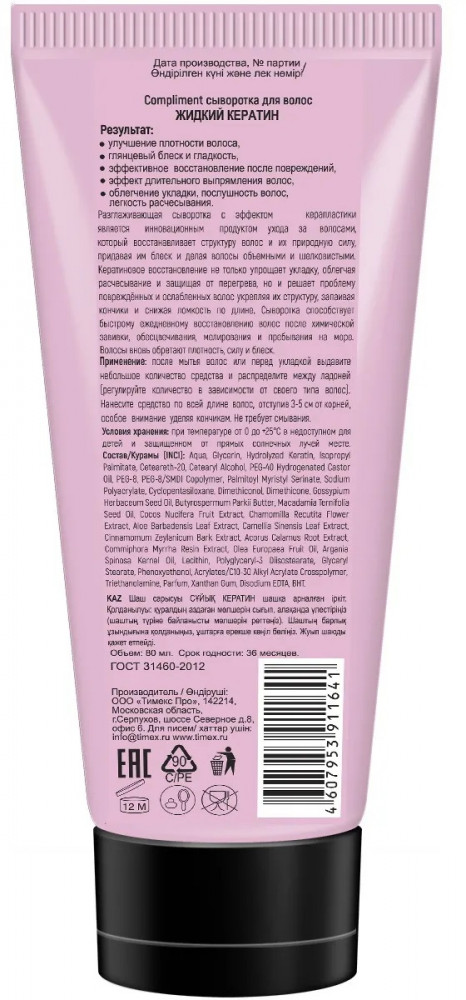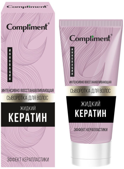 Compliment Сыворотка для волос «Жидкий кератин»В данный момент этот товар отсутствует в продаже. Возможно, у нас найдется аналогичный или похожий товар здесь. Сыворотка для волос «Жидкий кератин» — эффект салонной керапластики в домашних условиях. Разглаживающая сыворотка с эффектом керапластики является инновационным продуктом ухода за волосами, который восстанавливает структуру волос и их природную силу, придавая им блеск и делая волосы объемными и шелковистыми. Сыворотка не только упрощает укладку, облегчая расчесывание и защищая от перегрева, но и решает проблему повреждённых и ослабленных волос укрепляя их структуру, запаивая кончики и снижая ломкость по длине. Сыворотка способствует быстрому ежедневному восстановлению волос после химической завивки, обесцвечивания, мелирования и пребывания на море. Волосы вновь обретают плотность, силу и блеск. |