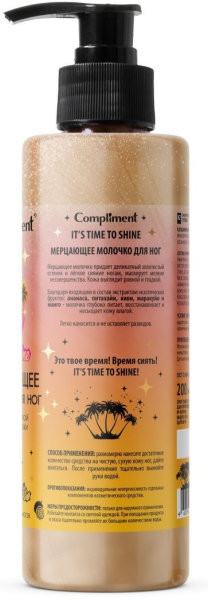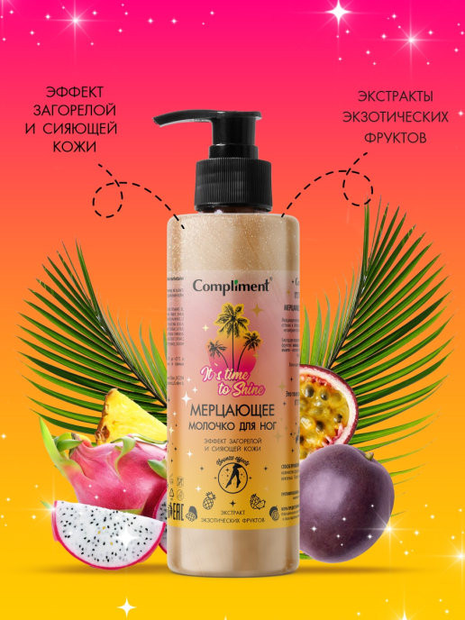 Compliment Молочко для ног мерцающееВ данный момент этот товар отсутствует в продаже. Возможно, у нас найдется аналогичный или похожий товар здесь. Серия: It's time to shine Мерцающее молочко придает деликатный золотистый оттенок и лёгкое сияние ногам, маскирует мелкие несовершенства. Кожа выглядит ровной и гладкой. Благодаря входящим в состав экстрактам экзотических фруктов: ананаса, питахайи, киви, маракуйи и манго — молочко глубоко питает, восстанавливает и насыщает кожу влагой. Легко наносится и не оставляет разводов. Это твое время! Время сиять! It’s time to shine! |