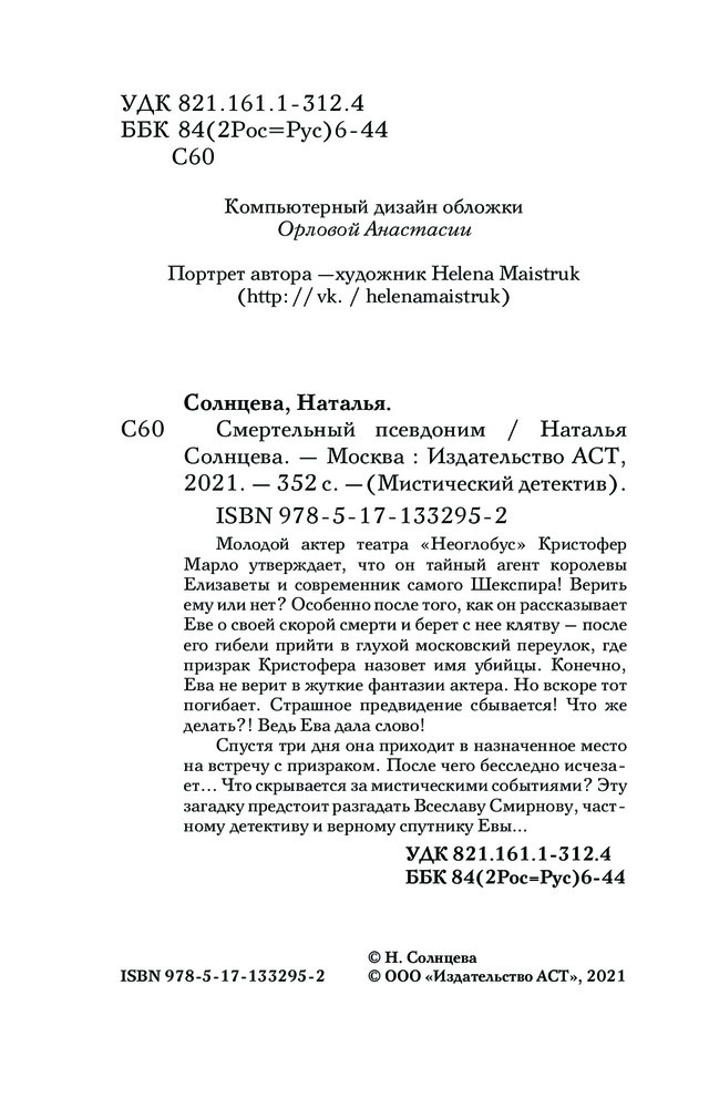 💳 Оплатить за товар можно при получении 🇰🇿 Есть бесплатная доставка по Казахстану от 1 дня 🎁 Копите бонусы с каждой покупки Серия: Мистический детектив Молодой актер театра «Неоглобус» Кристофер Марло утверждает, что он тайный агент королевы Елизаветы и современник самого Шекспира! Верить ему или нет? Особенно после того, как он рассказывает Еве о своей скорой смерти и берет с нее клятву — после его гибели прийти в глухой московский переулок, где призрак Кристофера назовет имя убийцы. Конечно, Ева не верит в жуткие фантазии актера. Но вскоре тот погибает. Страшное предвидение сбывается! Что же делать?! Ведь Ева дала слово! Спустя три дня она приходит в назначенное место на встречу с призраком. После чего бесследно исчезает... Что скрывается за мистическими событиями? Эту загадку предстоит разгадать Всеславу Смирнову, частному детективу и верному спутнику Евы... |
