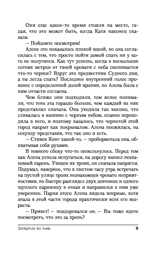 Запертые во тьмеВ данный момент этот товар отсутствует в продаже. Возможно, у нас найдется аналогичный или похожий товар здесь. Серия: Секретное досье. Новые страницы Команду Института исследований необъяснимого приглашают в Оренбургскую область, где огромная черная тень накрыла целый город. Связи с жителями нет, аппаратура внутри тени не работает. Военные смогли отыскать ряд входных «коридоров» и проникнуть в город, но вернуться удалось не всем. Тень увеличивается, держать в секрете происходящее становится все сложнее, но эвакуировать несколько тысяч человек невозможно, а оставлять их внутри феномена слишком опасно: по улицам запертого во тьме города бродят гигантские насекомые, по стенам домов расползается ядовитая плесень. Времени на принятие решения все меньше, а вопросов все больше... |